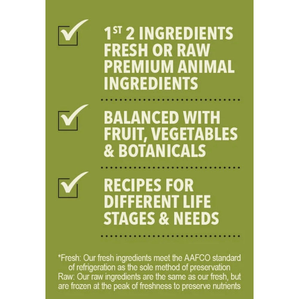 Fresh chicken meat (16%), chicken meal (14%), turkey meal (14%), red lentils, whole green peas, pea fibre, fresh chicken giblets (liver, heart, kidney) (5%), herring meal (5%), fresh whole eggs (4%), fresh whole flounder, (4%), sun-cured alfalfa (4%), field beans (4%), green lentils, whole yellow peas, chicken fat (1%), herring oil, (1%), fresh chicken cartilage (1%), dried brown kelp, fresh whole pumpkin, fresh whole butternut squash, fresh whole parsnips, fresh kale, fresh spinach, fresh mustard greens, fresh turnip greens, fresh whole carrots, fresh red delicious apples, fresh Bartlett pears, freeze-dried chicken liver, freeze-dried turkey liver, fresh whole cranberries, fresh whole blueberries, chicory root, turmeric, milk thistle, burdock root, lavender, marshmallow root, rose hips. Supplements Zinc Chelate, Vitamin E (preservative).