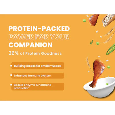 OPTIMAL PROTEIN FOR ENERGY & MUSCLE -With a strong 26% protein content sourced from real chicken, green peas, and liver hydrolysate, our food fuels the high energy levels and supports the lean muscle of small breeds, helping them maintain a healthy weight and stay active. It is specially crafted to meet the unique nutritional needs of small and mini breed adult dogs, such as Shihtzu, Pug Chihuahuas, Pomeranians, , and Dachshunds. This premium formula provides balanced nutrition to keep your little companion full of energy, healthy, and happy.