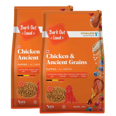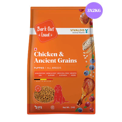 GENTLE ON TINY TUMMIES : The inclusion of dietary fiber-rich grains, such as naked oats and barley, supports easy digestion crucial specially for young puppies. It further ensures they can absorb nutrients effectively. The gentle nature of Bark Out Loud's puppy food minimizes the risk of discomfort or tummy troubles, allowing your furry friend to enjoy mealtime without any worries.