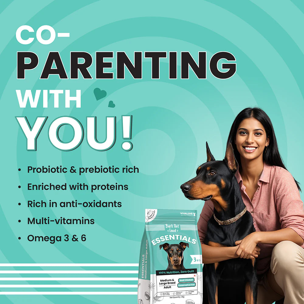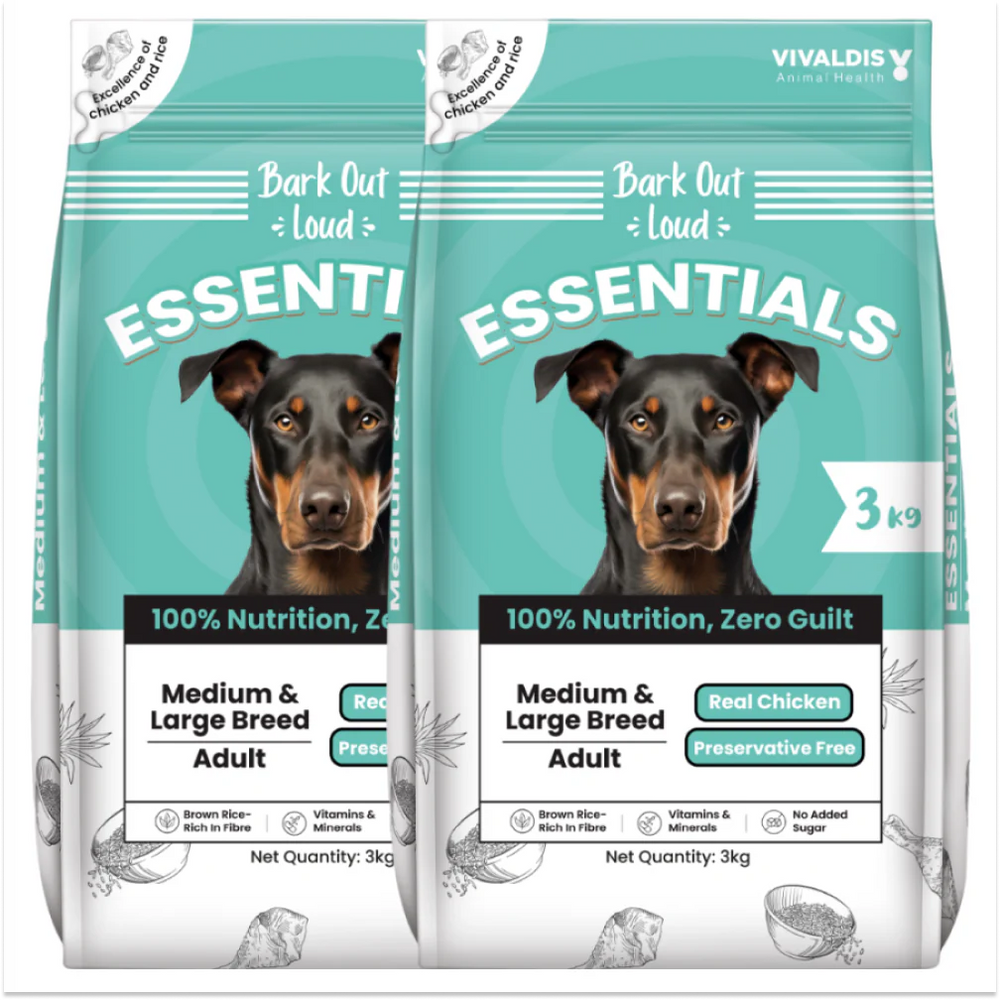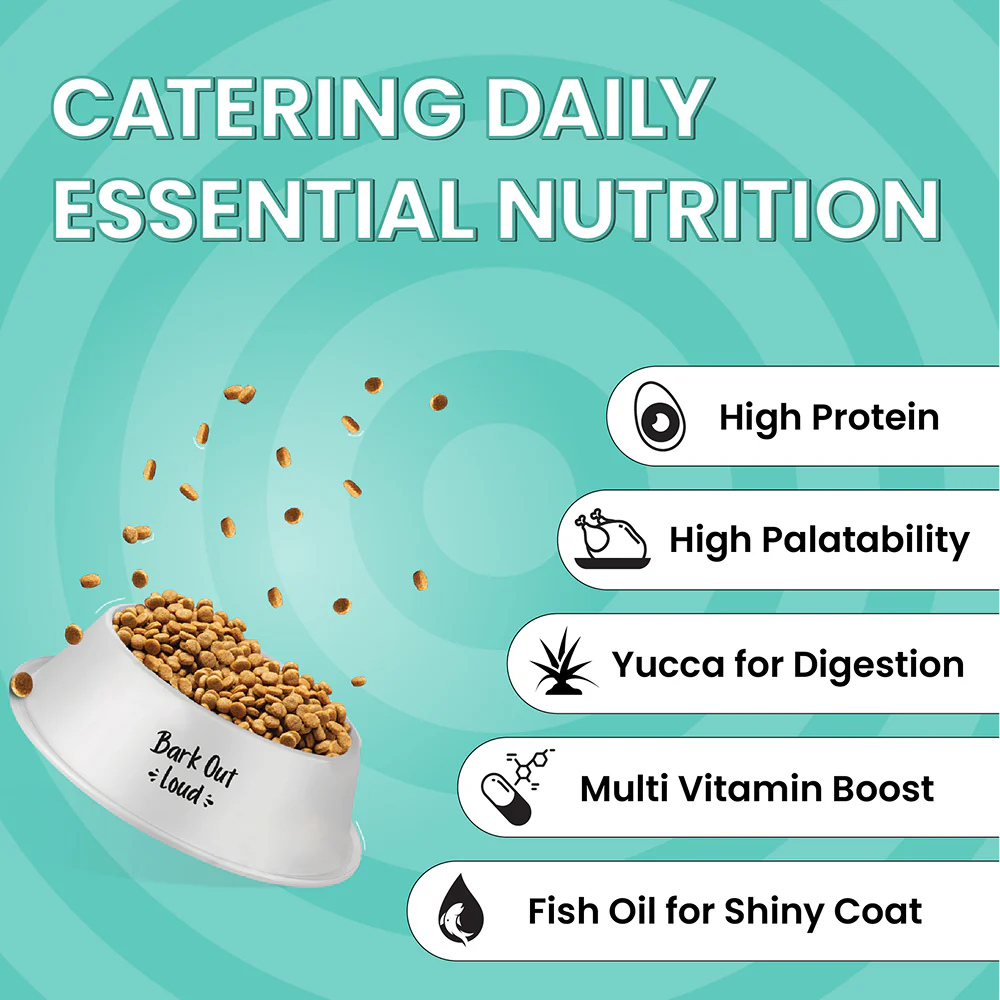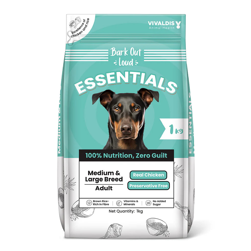 BALANACED & NUTRITIOUS FORMULA -Bark Out Loud’s Essential Range dog food is tailor-made for large and medium breeds, boasting a blend of protein, fiber, and essential vitamins. Free from guilt and preservatives, it offers conscientious pet owner’s peace of mind. Specially formulated to meet the nutritional needs of active dogs, it ensures optimal health and vitality. With a focus on natural ingredients and balanced nutrition, Bark Out Loud provides a wholesome diet that supports the well-being