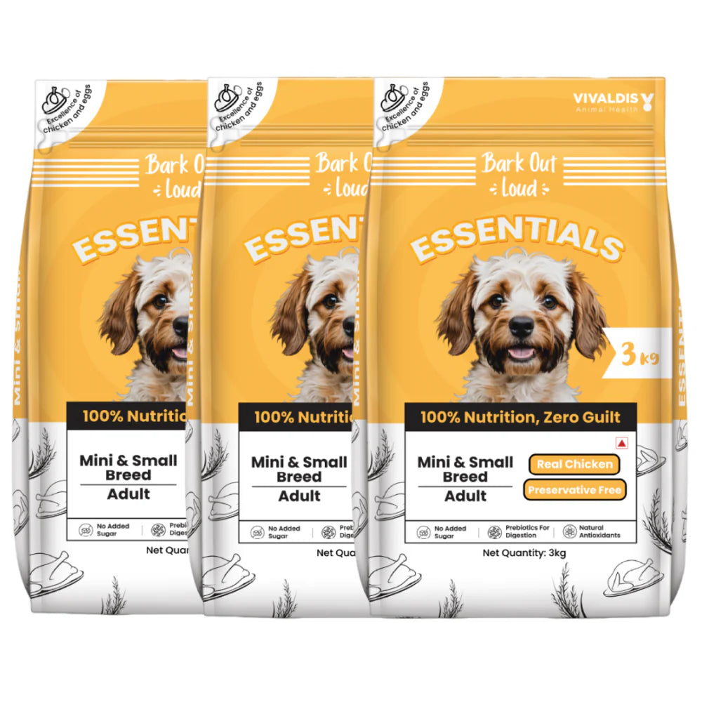 NUTRITIOUS BLEND -Bark Out Loud’s Essential food for dogs offers a nutritious blend tailored for mini and small breeds. Packed with high-quality chicken and egg protein, it ensures optimal growth and energy. Our kibbles provide essential nutrients for overall health, promoting strong muscles, shiny coats, and vibrant energy levels in your beloved furry friend. With a crude protein (min.) 22% and crude fat (min.) 10%, we have ensured a balanced ratio of protein and fat.