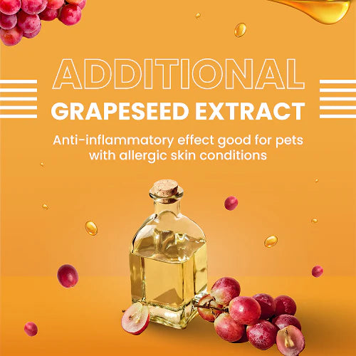 TURMERIC, PUMKIN & GRAPE SEED: Bioactive Curcumin (turmeric) reduces free radical damage at the skin level and hydrates it leaving the coat glowing and shiny. Pumpkin is packed with antioxidants and Vitamin A that boosts collagen production to improve skin tone. Grape seed extract maintains skin health and elasticity.