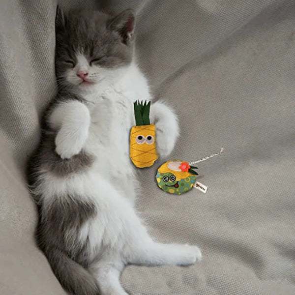 Catnip is a plant related to mint and contains an essential oil called nepetalactone that is known to cause euphoric, calming, and relaxing effects on cats. Catnip in small doses is completely safe, non-addictive for your kitten as the effects last about 10 mins for most cats. Fofos summer cat toys (juice and pineapple) are cute cat playing toys filled with imported US grade catnip dried leaves and grass powder. These Interactive toys allow your cat to chew, swat,nip, play,and even promote harmless biting and scratching. Fun engaging cat toys give your cat a mouse chase-like feeling ensuring good physical stimulation while the catnips give them a calm and relaxing experience. Ideal for small pet kittens above 6 months of age as well as for older cats of Persian and other breeds as well.