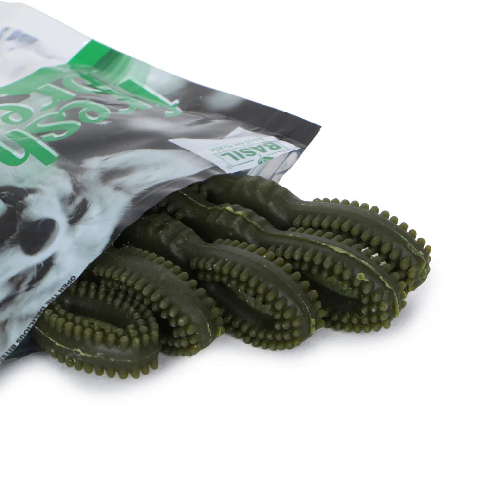 Basil fresh breath dental chew treat is a flexible dental bone with outer soft teeth cleaning particles two hollow ends could more effectively get into teeth gap, all around teeth cleaning. Unique refreshing ingredients could effectively remove toxin and improve digestion. This product is very effective in reducing mouth odour and healthy shit.