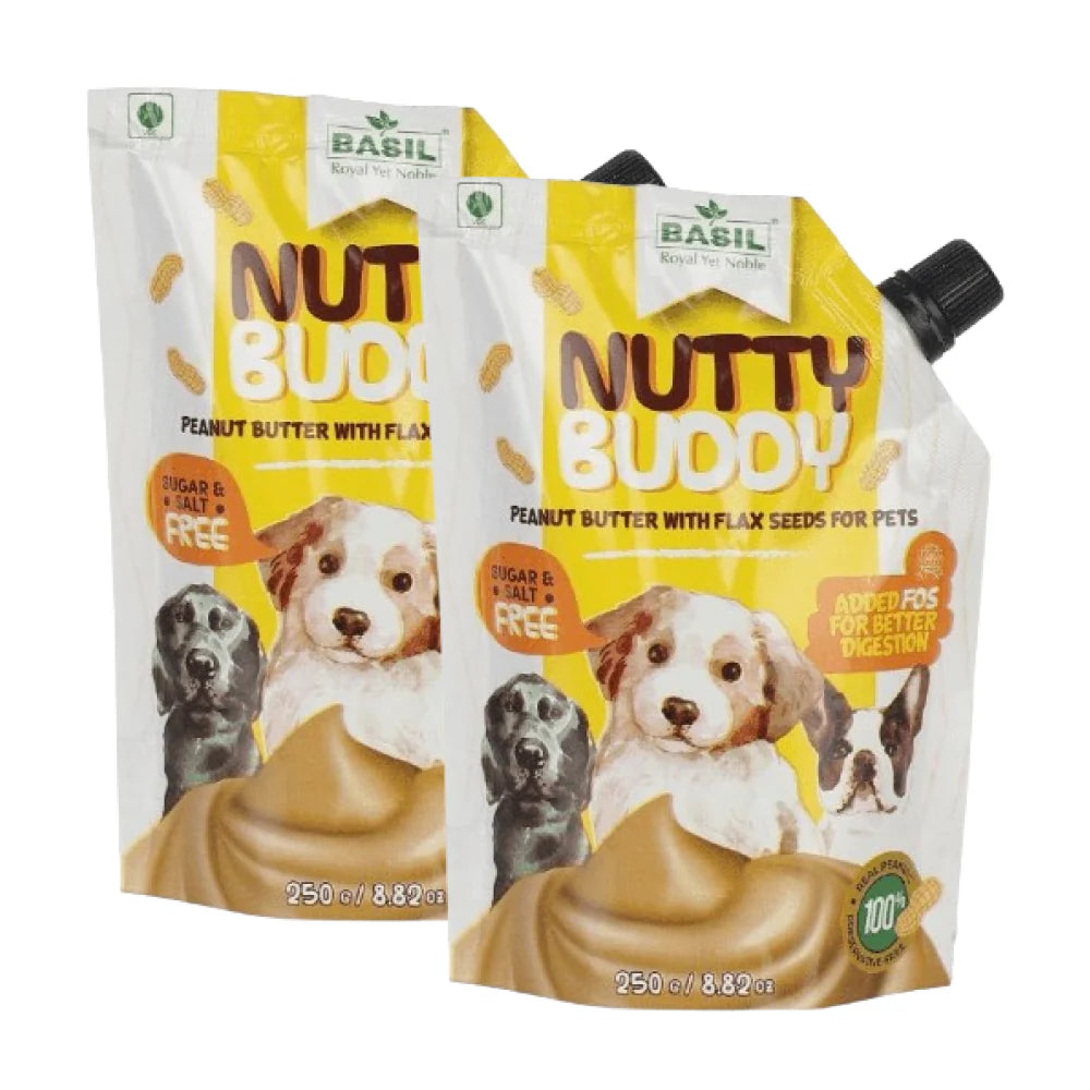 Basil Nutty Buddy Peanut Butter with Flax Seeds is perfectly suited for your dog's unique nutritional needs. It is an unsalted and unsweetened all-natural treat. With an ideal balance of complete protein, Omega-3, and Omega-6 fatty acids, it promotes healthy muscles, joints, skin, and coats. This dog treat is enhanced with FOS prebiotic for added fiber, this peanut butter is highly digestible and free of trans-fat which helps in reducing cholesterol.