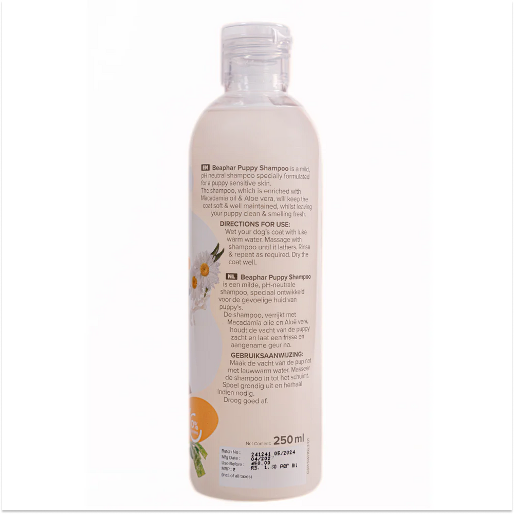 Beaphar Puppy Shampoo is a mild shampoo suitable for sensitive puppy skin, effective shampoo for both short and long-haired Puppies. The shampoo, which is enriched with Macadamia Oil & Aloe Vera, helps to Nourish & Hydrate the skin, promotes a soft, glossy coat, whilst leaving your puppy clean and smelling fresh. Specially formulated for puppies older than 12 weeks.