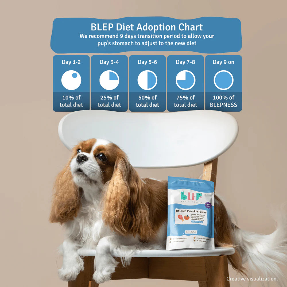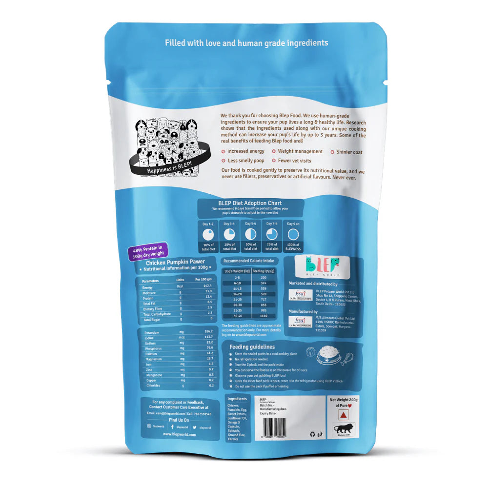 Introducing BLEP's Chicken Pumpkin Pawer Fresh Dog Food! This premium dog food is the perfect choice for pet owners who want the best for their dogs. Our Chicken Pumpkin Pawer Dog Food is made with only the freshest ingredients, including real chicken and pumpkin, to provide your dog with the nutrition they need to lead a long and healthy life. Chicken Pumpkin Pawer is formulated to provide your dog with the essential nutrients, vitamins and minerals they need to stay healthy and active. With this delicious and nutritious meal, you can rest assured that your dog is getting the best nutrition possible.