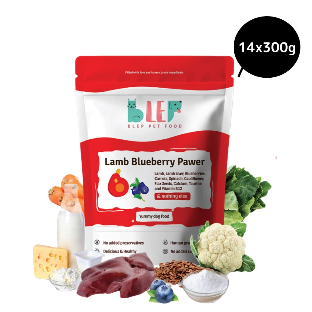 Introducing Lamb Blueberry Pawer Dog Food. Our recipe is a blend of minced lamb, liver, blueberries, carrots, spinach, cauliflower, flax seeds, calcium, taurine, and vitamin B12. It's pure goodness without any extras. Our Promise: 100% Natural, Sugar-Free, Preservative-Free, Gluten-Free.