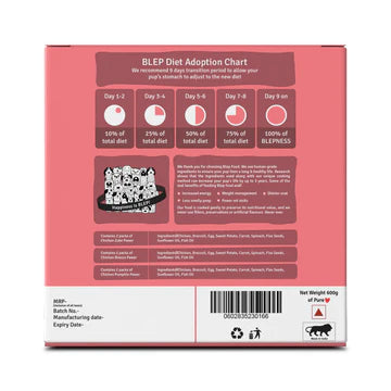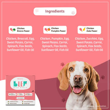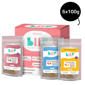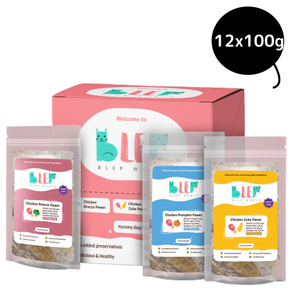 Introducing the BLEP Dog Food Trial Box! Are you looking for the best food for your beloved dog? Look no further than the BLEP Dog Food Trial Box! Our all-natural, grain-free dog food is designed to provide your dog with the nutrition they need to lead a long and healthy life. Our dog food is made with only the highest quality ingredients, including chicken breast, egg, fish oil, sunflower oil and vegetables. We never use fillers, artificial colours, or preservatives, so you can be sure your pup is getting the best nutrition possible. Plus, our dog food is designed to be easy to digest, so your dog can get the most out of every meal. The BLEP Dog Food Trial Box is the perfect way to try out our 3 flavours and see if it's the right fit for your dog. Plus, you can rest easy knowing that you're giving your dog the best nutrition available. At BLEP, we understand that your pup is more than just a pet, they are your family. That's why we strive to provide the best nutrition possible, so you can be confident that your dog is getting the best care. Choose BLEP today for your dog's long and healthy life.