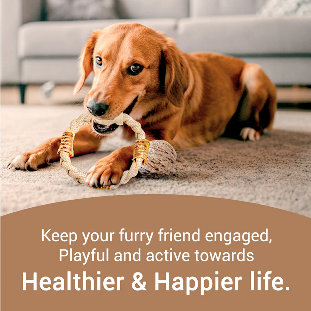 The circular shape is easy for dogs to grip, carry, and toss, while the tightly woven rope helps clean teeth and support gum health during play. Whether your dog enjoys a solo chew session or a spirited game of tug, this donut rope toy delivers both fun and function.