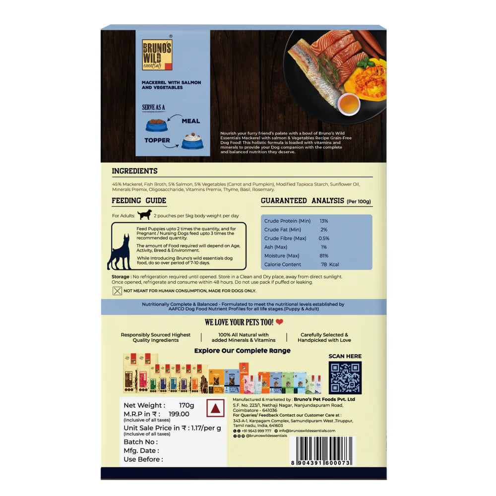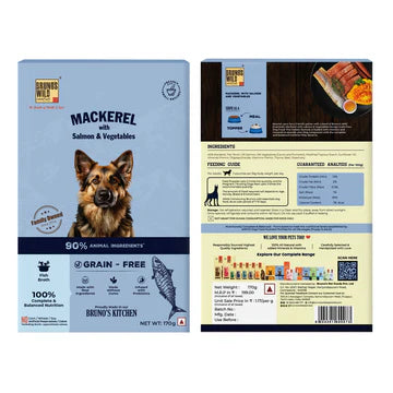 Nourish your furry friend’s palate with a bowl of Bruno’s Wild Essentials Mackerel with salmon & Vegetables Recipe Grain-Free Canned Dog Food! This holistic formula is loaded with vitamins and minerals to provide your Dog companion with the complete and balanced nutrition they deserve. Its is suitable for all life stages!