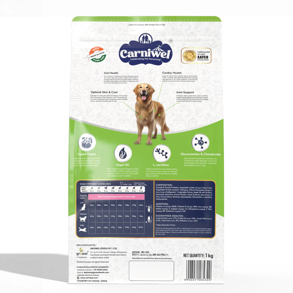 Carniwel Dry Dog Food is specially formulated for large breed adult dogs aged 1 year and older, addressing their unique dietary needs. This vegetarian formula includes glucosamine and chondroitin to support and maintain healthy joints. High-quality cereals and yeast extracts ensure easy digestion and optimal gut health, helping your dog feel their best every day. Enriched with flaxseeds, a rich source of Omega-3 and Omega-6 fatty acids, along with beta-carotene, Carniwel promotes healthy skin and a shiny, lustrous coat. Offering complete and balanced nutrition, Carniwel supports the overall health and development of your large breed adult dog. Choose Carniwel for a nutritious, delicious meal that keeps your dog thriving.