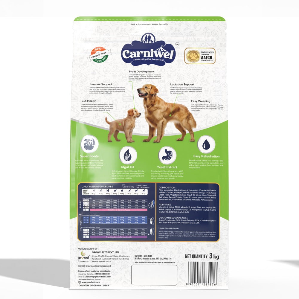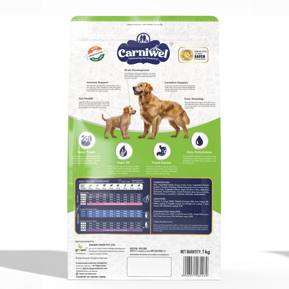 Carniwel Dry Dog Food is specially formulated for weaning large breed puppies. The small kibble can be easily rehydrated to a porridge-like consistency, making it perfect for young puppies. With its high palatability, Carniwel ensures a smooth transition during weaning. Packed with superfoods, this formula provides complete nutrition for healthy growth. It supports rehydration for a smooth, digestible meal and includes nutrients that aid in lactation support for the mother dog. Omega-3 and DHA from algal oil promote brain development and cognitive function. Additionally, vegetable fibers and yeast extracts ensure healthy digestion and optimal gut health. Choose Carniwel for a nutritious start that supports your large breed puppy’s overall development and well-being.