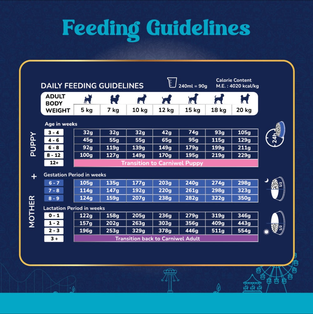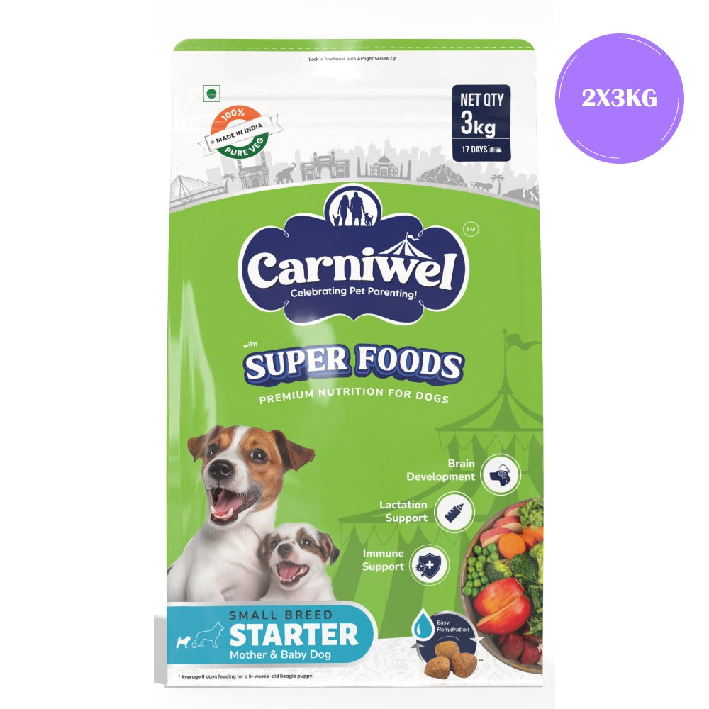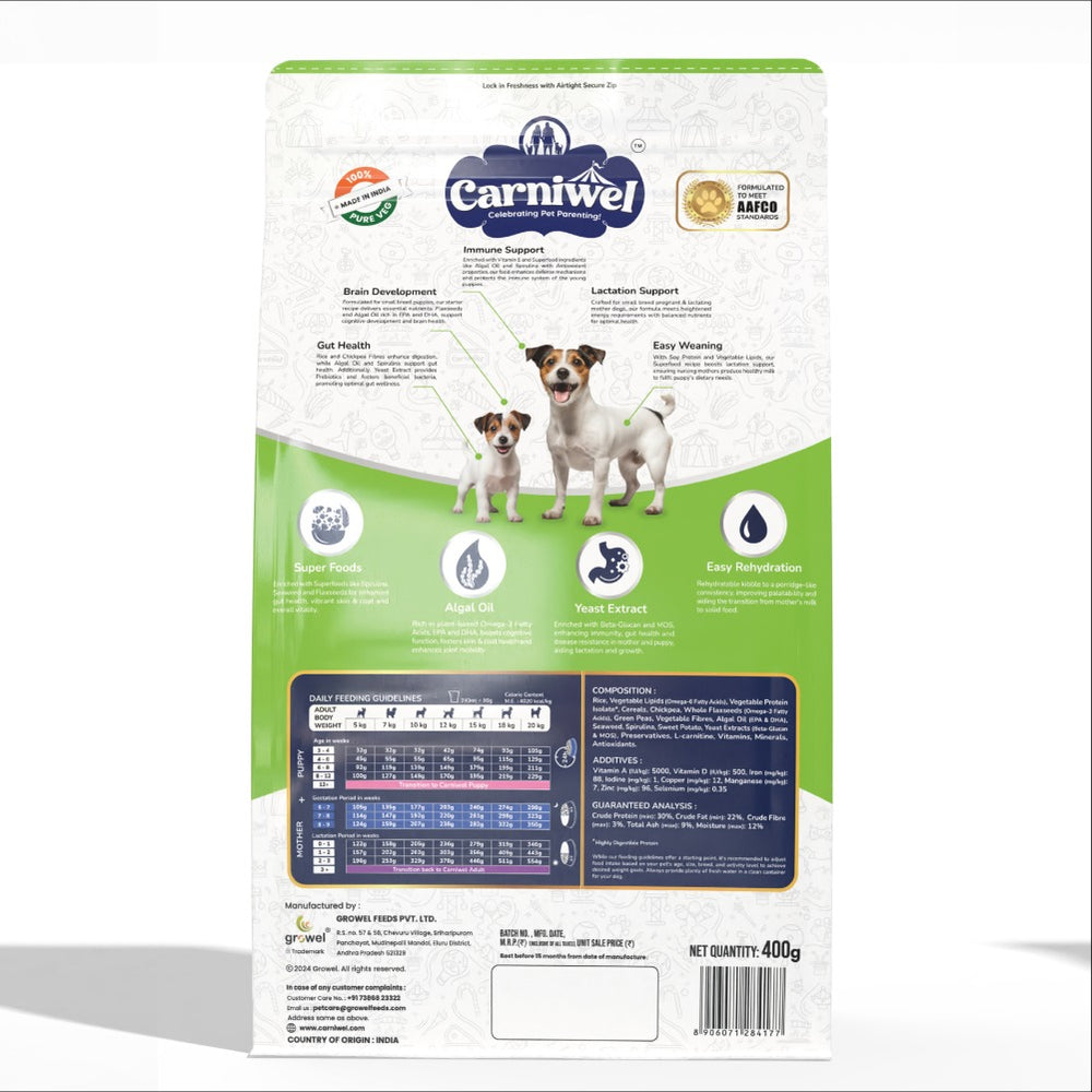 Carniwel Dry Dog Food is perfect for weaning small breed puppies. The specially designed small kibble can be easily rehydrated to a porridge-like consistency, making it ideal for young puppies. Its high palatability ensures a smooth transition to solid food. Packed with superfoods, Carniwel provides complete nutrition for healthy growth. The rehydratable kibble offers a smooth, digestible meal, supporting the mother dog's milk production during lactation. Superfoods like spirulina and seaweed boost immune health, while Omega-3 and DHA from algal oil support brain development and cognitive function. Choose Carniwel for balanced, nutritious, and delicious meals that help your small breed puppies thrive.