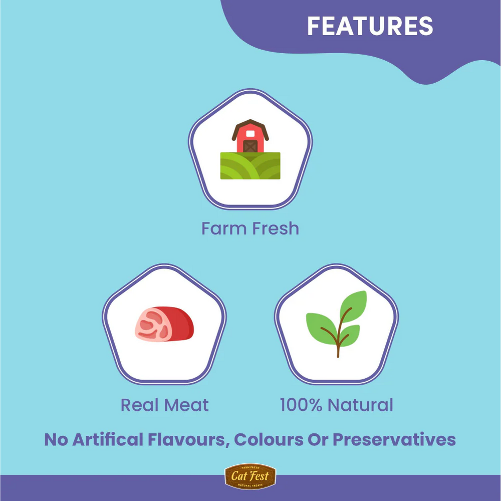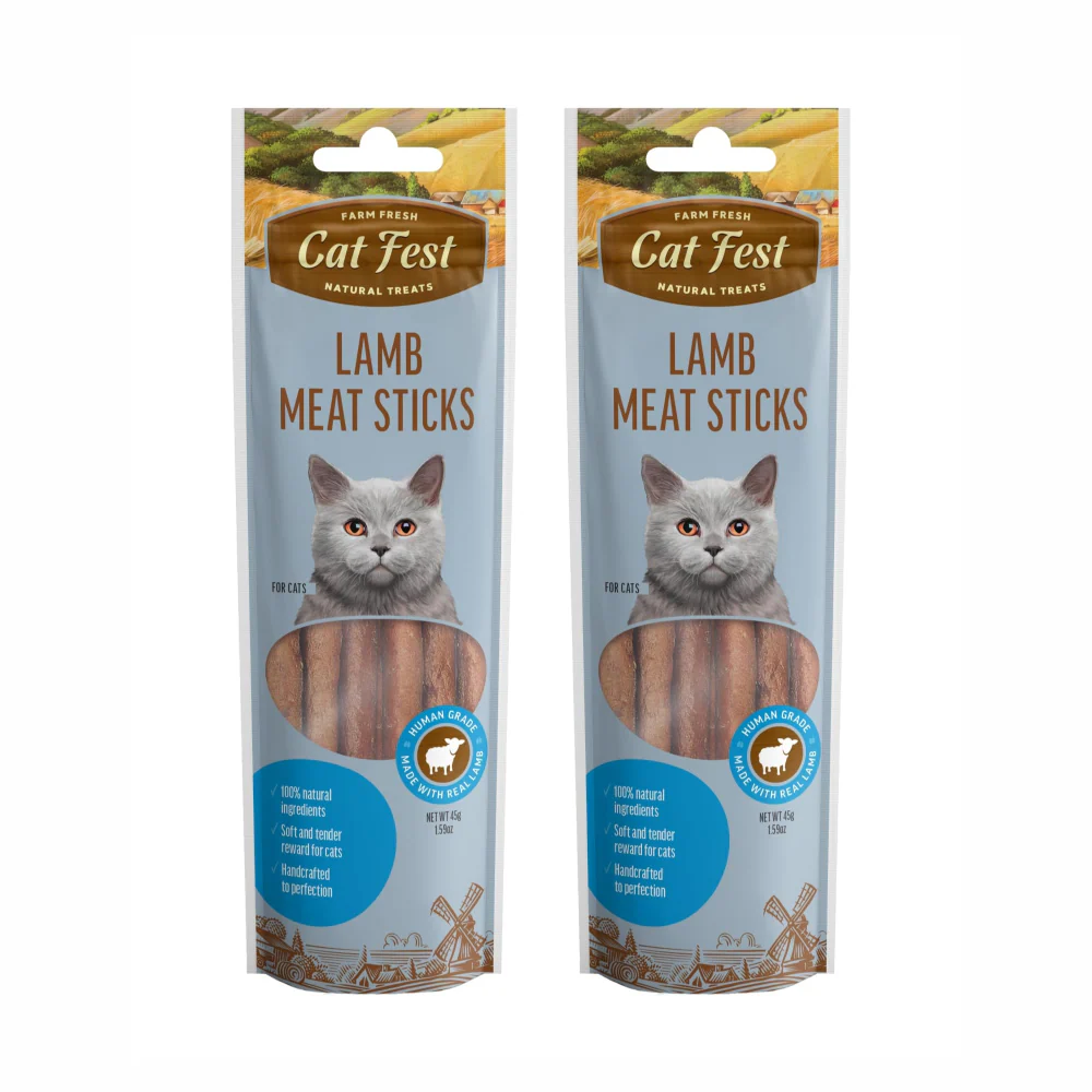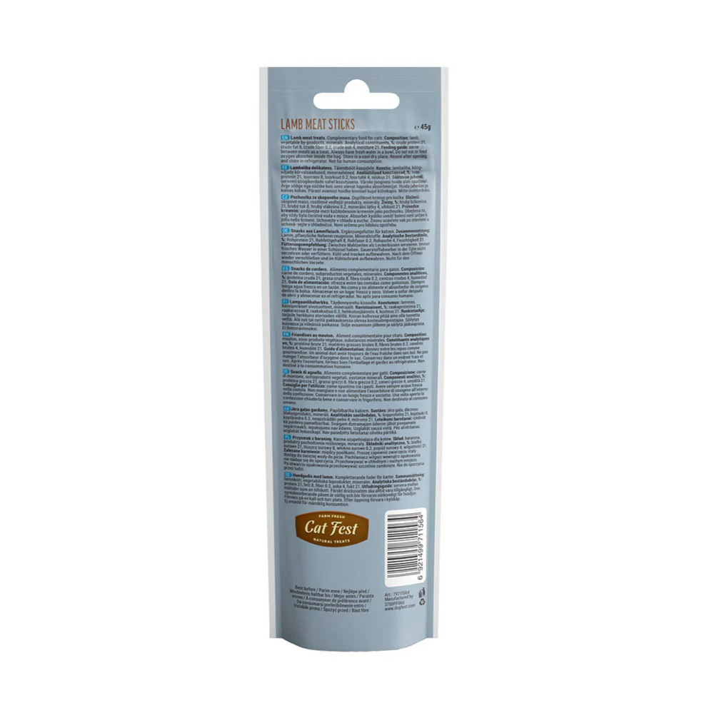 Introducing CatFest Meat Sticks lamb for cats – a scrumptious and nutritious treat that your feline friend will adore! Made with 100% natural and healthy ingredients, our cat treats are free from artificial flavors, colors, or preservatives. We proudly use human-grade meat, sourced directly from farms, ensuring the highest quality protein for your fur baby. Our protein-packed recipe is perfect for cats of all breeds, including adult, Persian, and kittens under 1 year of age. The delightful aroma of our high-palatability meat sticks will have your cat meowing for more, whether it's for training or just a delicious snack. Grab you CatFest Meat Sticks, available in chicken, lamb & duck flavors. Let your cat indulge in the best, chewy treats they can't resist!