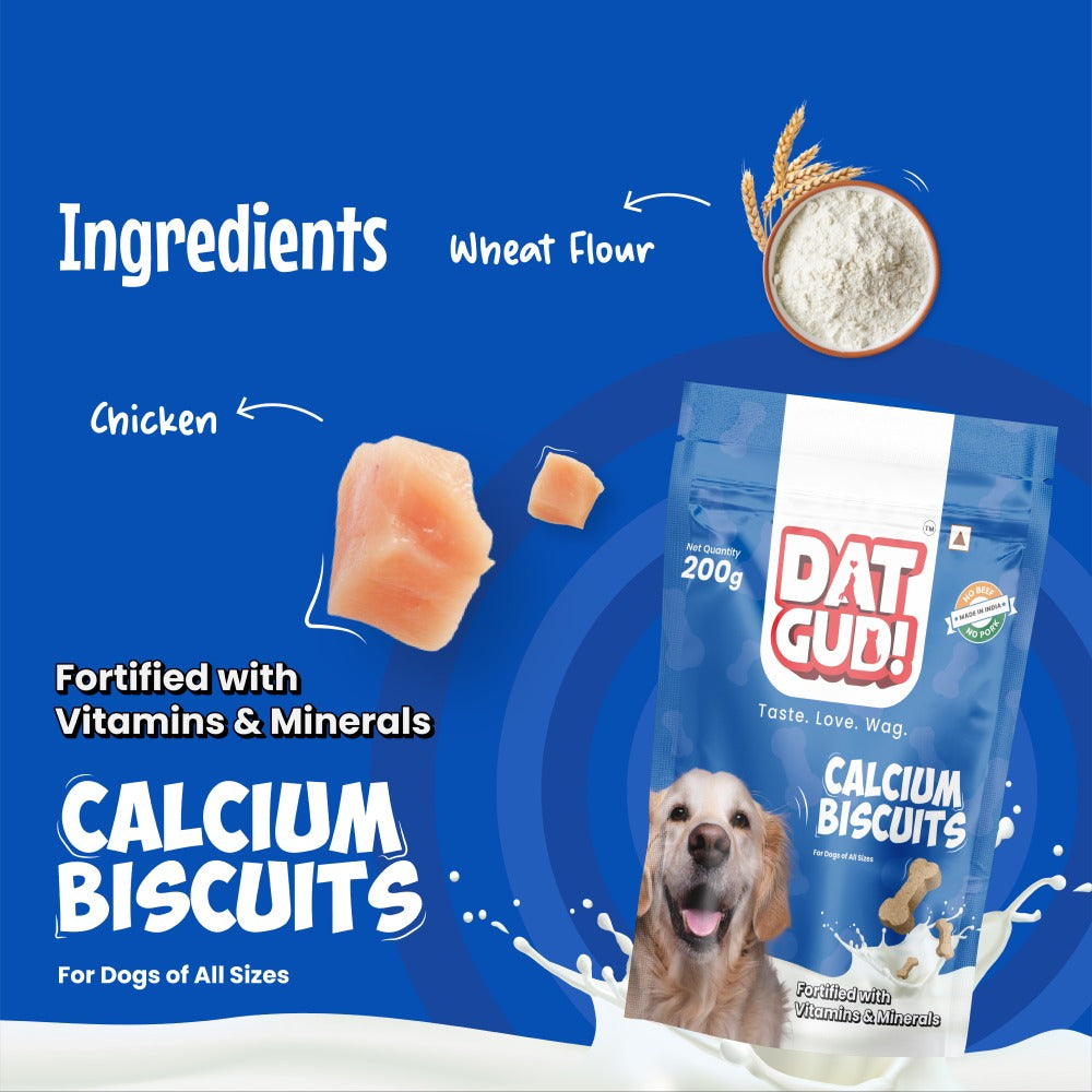 Introducing DatGud Calcium Dog Biscuits with Milk, the ultimate treat for your furry friend's bone and joint health! Specially formulated to provide essential nutrients for stronger bones and healthier joints, these biscuits are perfect for dogs of all breeds. Each biscuit is packed with high-quality calcium, sourced from natural ingredients, to support bone development and maintenance. The addition of milk ensures a creamy texture and irresistible taste that your dog will love. Whether you have a growing puppy or a senior dog, these treats are suitable for dogs of all ages, helping to keep their bones strong and their joints supple. Plus, they make training sessions or simply rewarding your pup a delightful experience. Give your canine companion the gift of strong bones and healthy joints with DatGud Calcium Dog Biscuits. Because when it comes to your dog's health and happiness, nothing but the best will do!