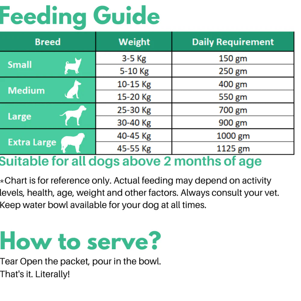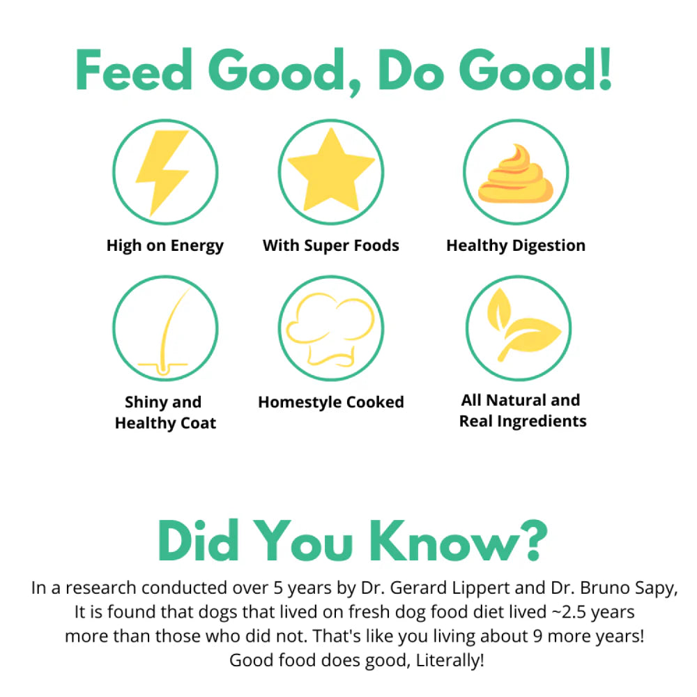 Doggos Big Monster (Fresh Dog Food) is a pack of 4 meals of 200 grams each, it is filled with freshest of ingredients that's not only good for your dog's health, but also for a balanced nutrition. This is an ideal every day Fresh dog food, packed with all vitamins and minerals for overall health of the dog. Good for all dogs above 3 months.