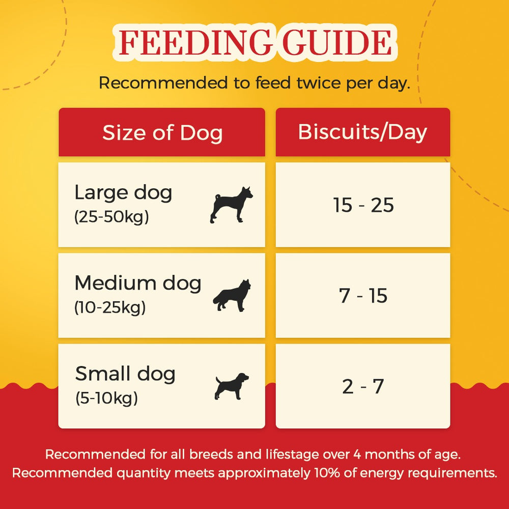 FEEDING GUIDE Recommended to feed twice per day. Size of Dog: Large dog (25-50 kg) Biscuits per day: 15 - 25 Size of Dog: Medium dog (10-25 kg) Biscuits per day: 7 - 15 Size of Dog: Small dog (5-10 kg) Biscuits per day: 2 - 7 Recommended for all breeds and lifestage over 4 months of age. Recommended quantity meets approximately 10% of energy requirements.
