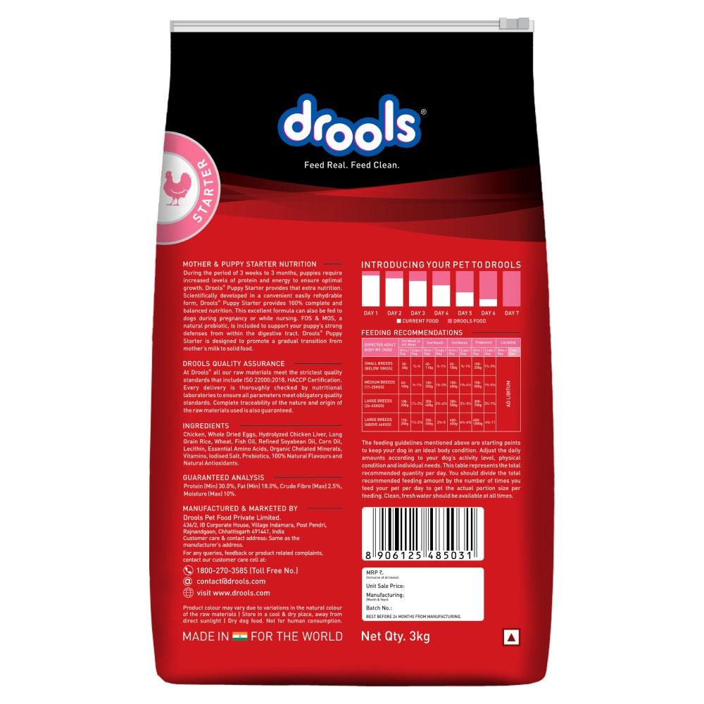During the period of 3 weeks to 3 months, puppies require increased levels of protein and energy to ensure optimal growth. Drools Puppy Starter provides that extra nutrition. Scientifically developed in a convenient easily rehydrable form, Drools Puppy Starter provides 100% complete and balanced nutrition. This excellent formula can also be fed to dogs during pregnancy or while nursing. FOS & MOS, a natural prebiotic, is included to support your puppy's strong defenses from within the digestive tract. Drools Puppy Starter is designed to promote a gradual transition from mother's milk to solid food