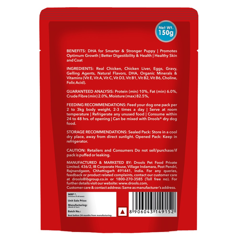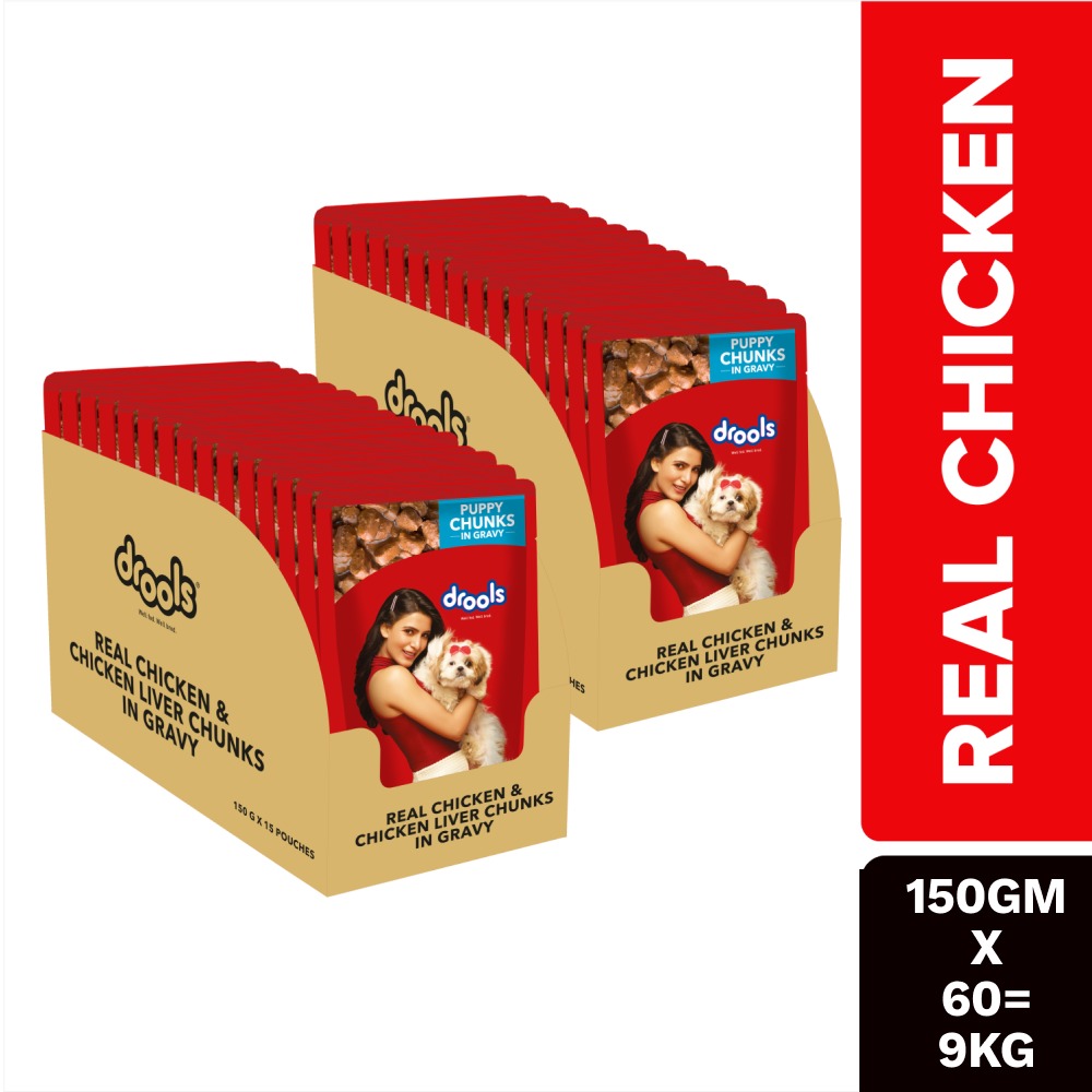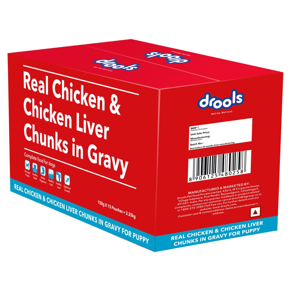 Drools Real Chicken and Chicken Liver in gravy offer your puppy fresh and tasty wet food at every meal.This great-tasting puppy food contains a high-quality omega 3 fatty acid to support your puppies brain & eye development. This pack contains mouth-watering flavour, so you can give your puppy a balanced diet with delicious and healthy. Your pet will love the gravy, which provides all the nutrients to fulfil your pet needs for a healthy life.