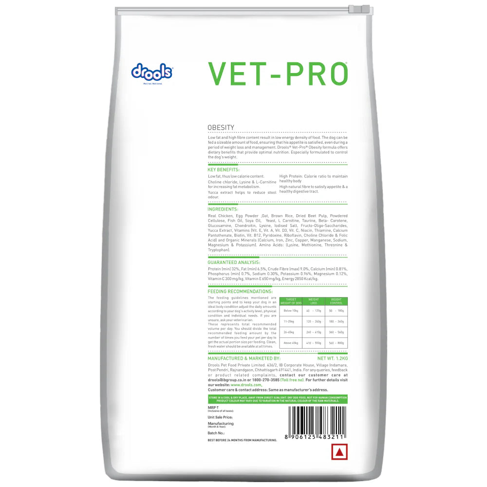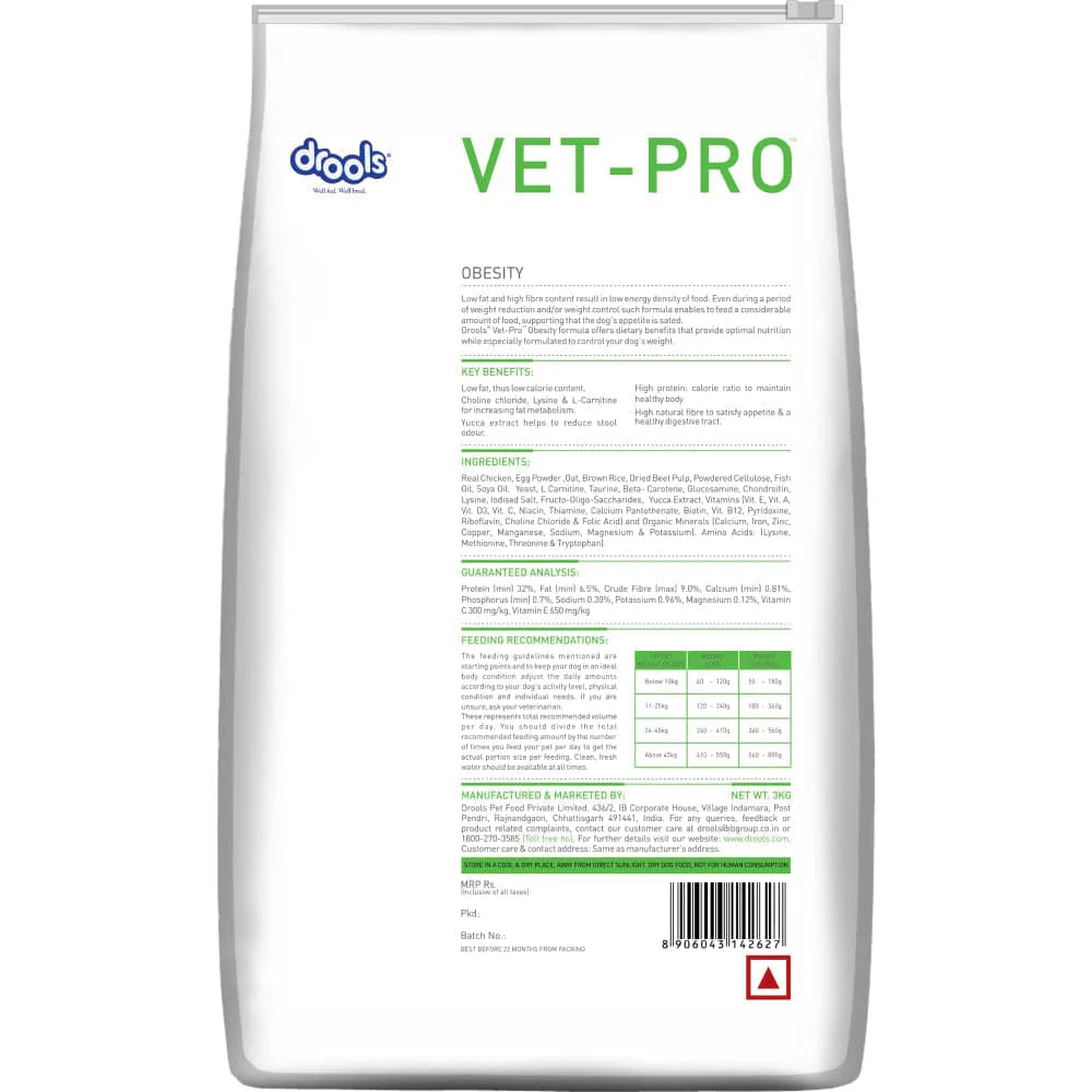 Vet Pro obesity contains low fat and high fibre content resulting in low energy density of the food. Even during a period of weight reduction or weight control, such formula enables to feeda considerable amount of food, supporting that the dog's appetite is sealed. Completely formulated in the US by veterinarians and animal experts based on the particular requirement of the pet with the obesity. It can be given in the case of Generalised Obesity. Neutralised dogs (Spayed/Castrated), Fibre responsive colitis, Thyroid related issues, Constipated patients. Drools Vet Pro Obesity formula offers dietary benefits that provide optimal nutrition while specially formulated to control your dog's weight.