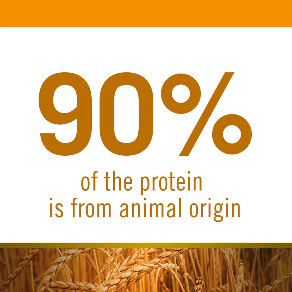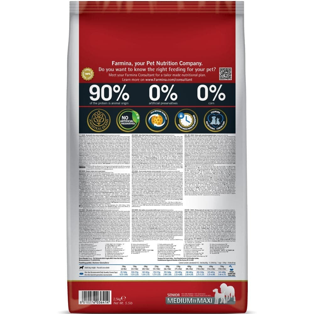 Fresh boneless chicken (20%), dehydrated chicken meat (18%), spelt (10%), oats (10%), chicken fat, fresh herring, dehydrated herring, dehydrated whole eggs, dried beet pulp, fish oil, fiber vegetable of peas, dried alfalfa, dried carrots, inulin, fructooligosaccharides, mannan-oligosaccharides, pomegranate powder (0.5%), dehydrated apple, spinach powder, psyllium (0.3%), powdered blackcurrant, dehydrated sweet orange, powdered blueberries, sodium chloride, dried brewer’s yeast, turmeric root (0.2%), glucosamine, chondroitin sulfate, Marigold extract (source of lutein).