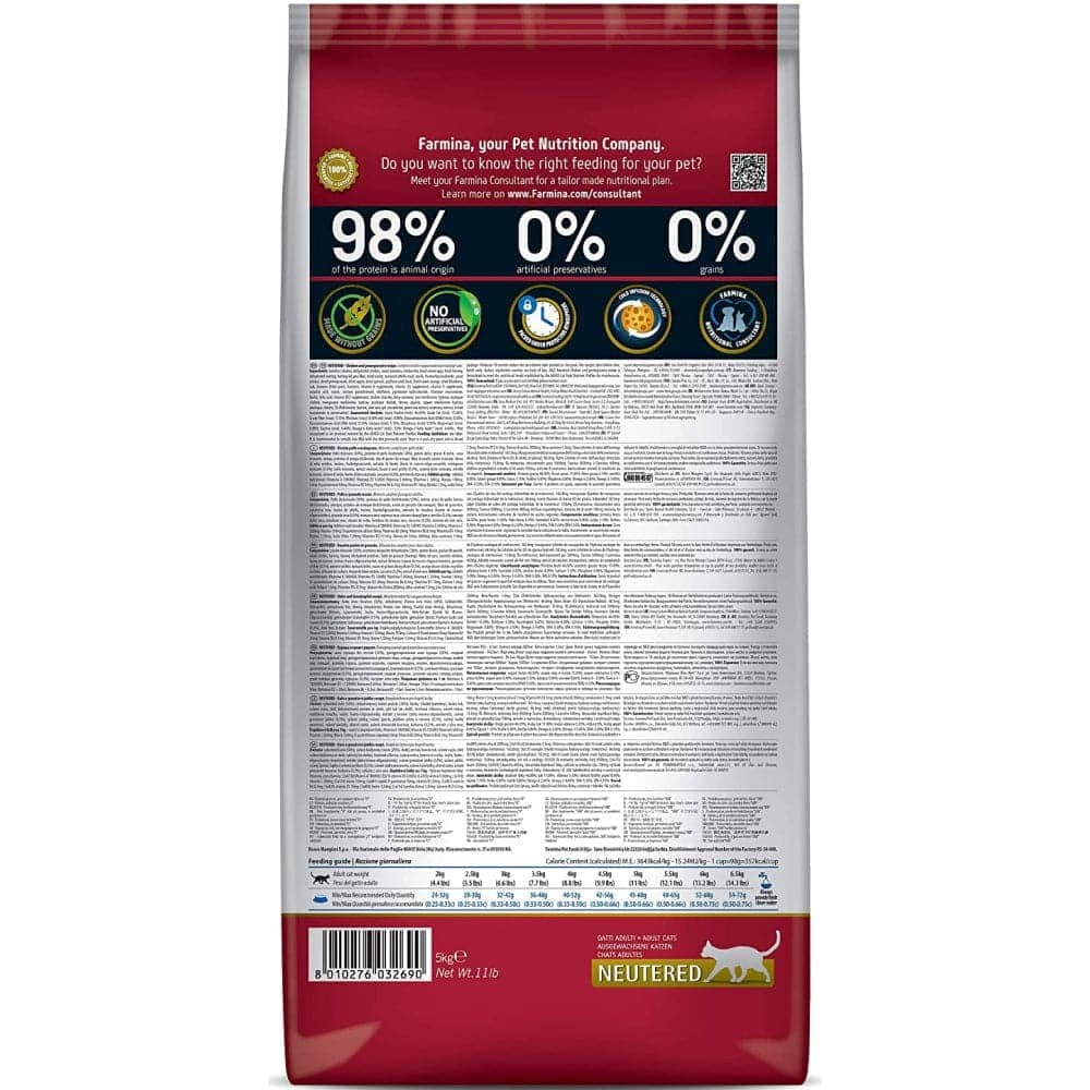 Made especially for cats/felines, the Farmina N&D Neutered Adult Dry Cat Food Grain Free Chicken and Pomegranate is made with easily digested chicken protein. 98% of the protein is of animal origin. It contains no grains and is also devoid of artificial preservatives and GMO products.