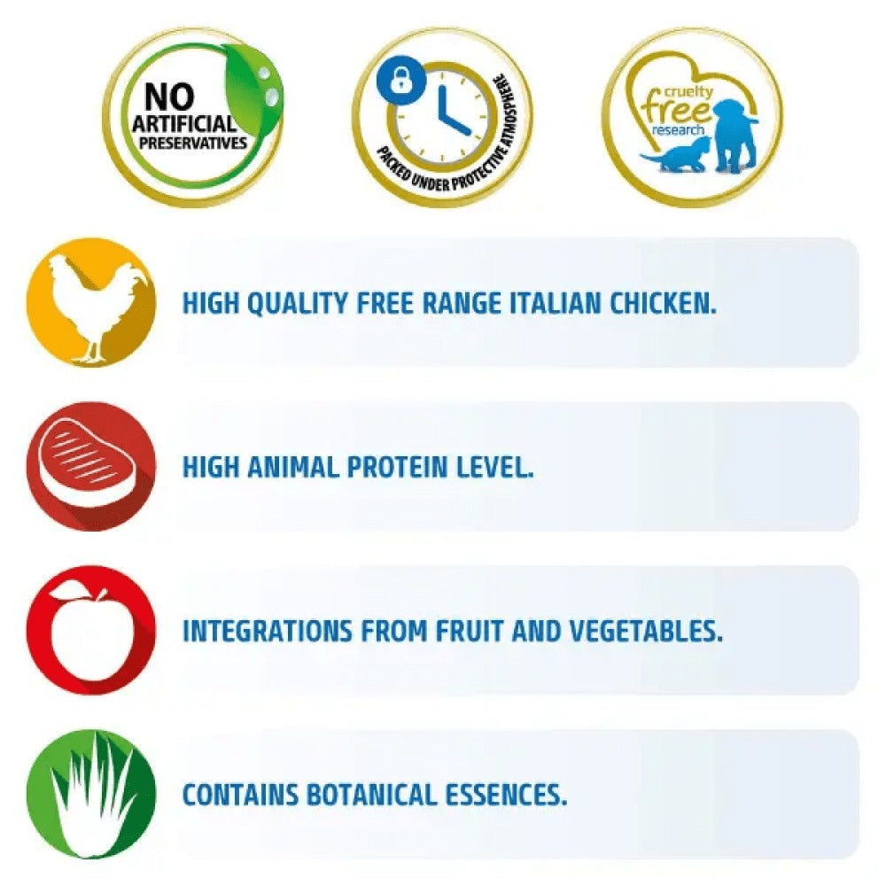 Fresh boneless chicken (30%), dehydrated chicken meat (28%), potatoes, chicken fat, dehydrated whole eggs, fresh herring, dehydrated herring, fish oil, hydrolyzed animal proteins, fiber vegetable of peas, dried carrots, dried alfalfa, inulin, fructooligosaccharides, mannan-oligosaccharides, pomegranate powder (0.5%), dehydrated apple, spinach powder, psyllium (0.3%), powdered blackcurrant, dehydrated sweet orange, powdered blueberries, sodium chloride, dried brewer’s yeast, turmeric root (0.2%), glucosamine, chondroitin sulfate, Marigold extract (source of lutein).