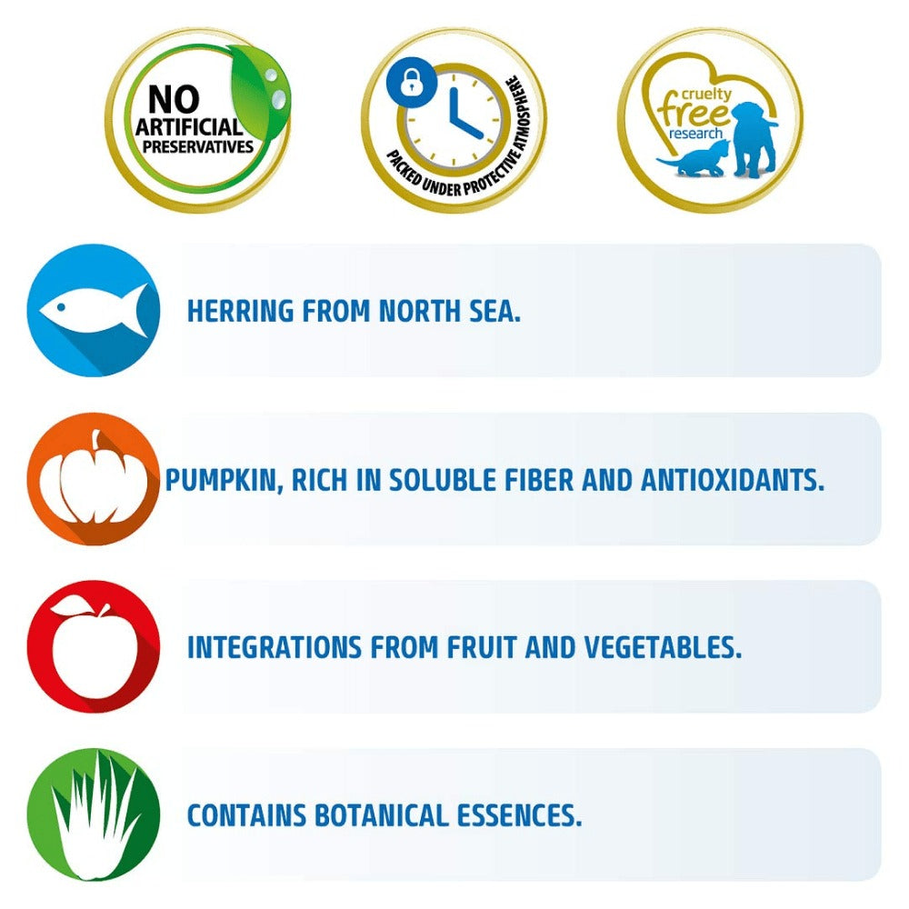 Fresh herrings (32%), dehydrated herrings (30%), sweet potatoes, fish oil (from herring), dried whole eggs, fiber vegetable of peas, dried carrots, dried alfalfa, inulin, fructooligosaccharides, yeast extract (source of mannan-oligosaccharides), dried sweet orange (0.5%), dried apple, dried pomegranate, dried spinach, psyllium (0.3%), dried blueberries, sodium chloride, dried brewer’s yeast, turmeric root (0.2%), glucosamine, chondroitin sulfate.