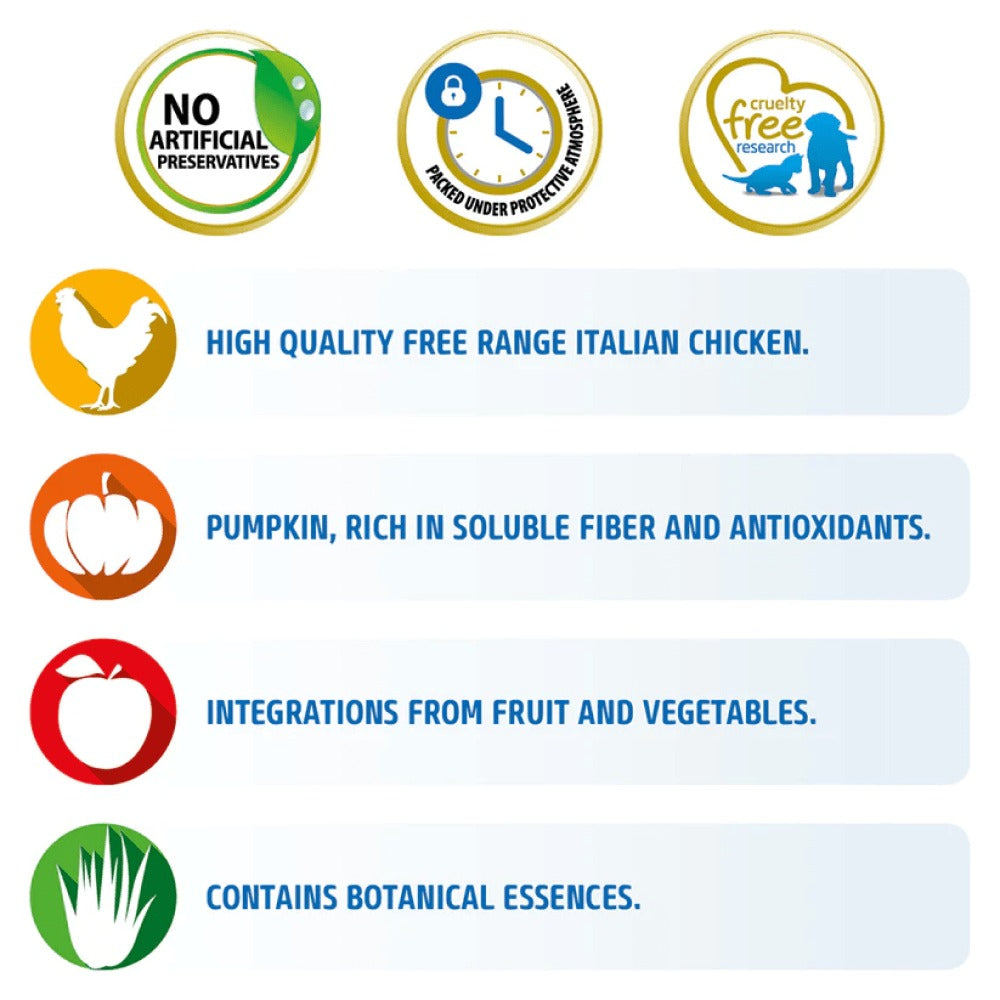 Boneless chicken (24%), dehydrated chicken protein (24%), pea starch, chicken fat, dehydrated herring protein, dried pumpkin (5%), herring, dried eggs, fish oil (from herring), pea fibre, dried carrot, alfalfa meal, chicken cartilage (source of glucosamine and chondroitin sulphate), inulin, fructo-oligosaccharides, yeast extract (source of manno-oligo-saccharides), dried pomegranate (0.5%), dried spinach, psyllium husks and seeds (0.3%), dried apple, dried sweet orange, dried blueberry, sodium chloride, dried brewers' yeast, turmeric (0.2%), aloe vera extract.