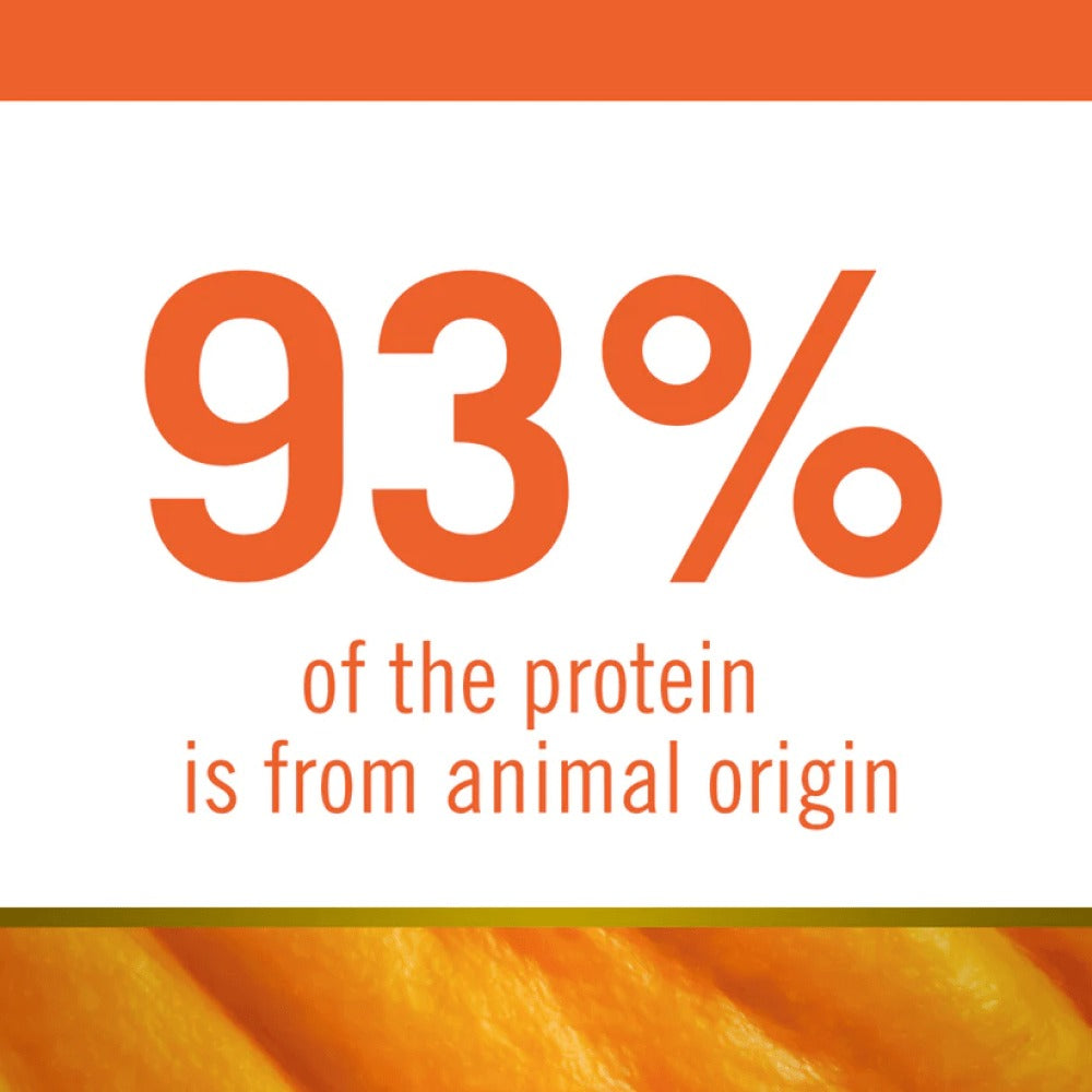 Boneless chicken (24%), dehydrated chicken protein (22%), pea starch, chicken fat, dehydrated herring protein, dried pumpkin (5%), herring, dried eggs, fish oil (from herring), chicken cartilage (source of glucosamine and chondroitin sulphate), alfalfa meal, pea fibre, inulin, fructo-oligosaccharides, yeast extract (source of manno-oligo-saccharides), dried pomegranate (0.5%), dried carrot, dried spinach, dried apple, psyllium husks and seeds, dried sweet orange, dried blueberry, sodium chloride, dried brewers' yeast, turmeric (0.2%), aloe vera extract.