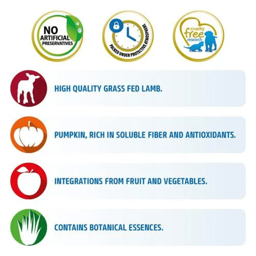 Fresh boneless lamb (22%), dehydrated lamb protein (20%), pea starch, chicken fat, dried pumpkin (5%), dried eggs, herring, dehydrated herring protein, fish oil (from herring), pea fibre, dried carrots, alfalfa meal, inulin, fructo-oligosaccharides, yeast extract (source of mannan-oligosaccharides), dried blueberry (0.5%), dried apple, dried pomegranate, dried sweet orange, dried spinach, psyllium husks and seeds (0.3%), sodium chloride, dried brewers’ yeast, turmeric (0.2%), aloe vera extract, glucosamine, chondroitin sulfate.