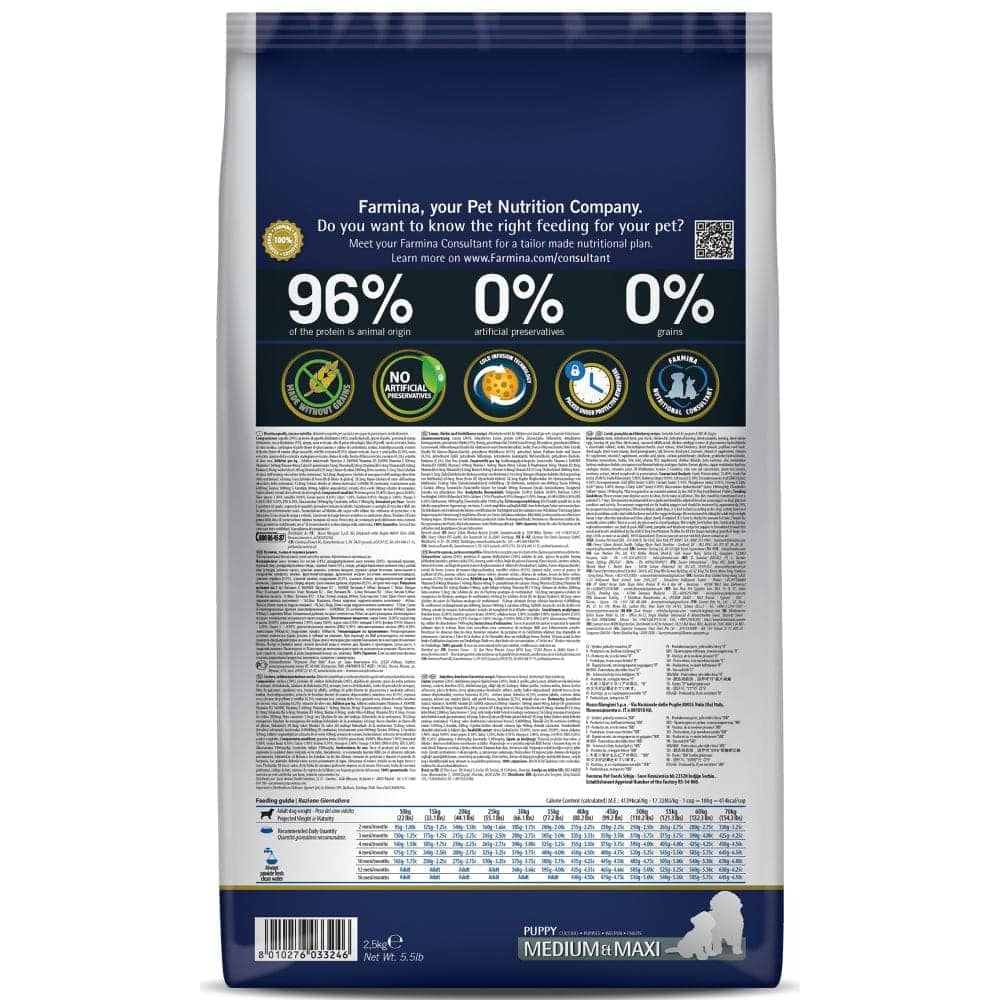 Fresh boneless lamb (24%), dehydrated lamb protein (24%), pea starch, chicken fat, dehydrated herring protein, dried pumpkin (5%), herring, dried eggs, fish oil (from herring), pea fibre, dried carrots, alfalfa meal, chicken cartilage (source of glucosamine e chondroitin sulfate), inulin, fructo-oligosaccharides, yeast extract (source of mannan-oligosaccharides), dried blueberries (0.5%), dried spinach, psyllium husks and seeds (0.3%), dried apple, dried sweet orange, dried pomegranate, sodium chloride, dried brewers’ yeast, turmeric (0.2%), aloe vera extract.