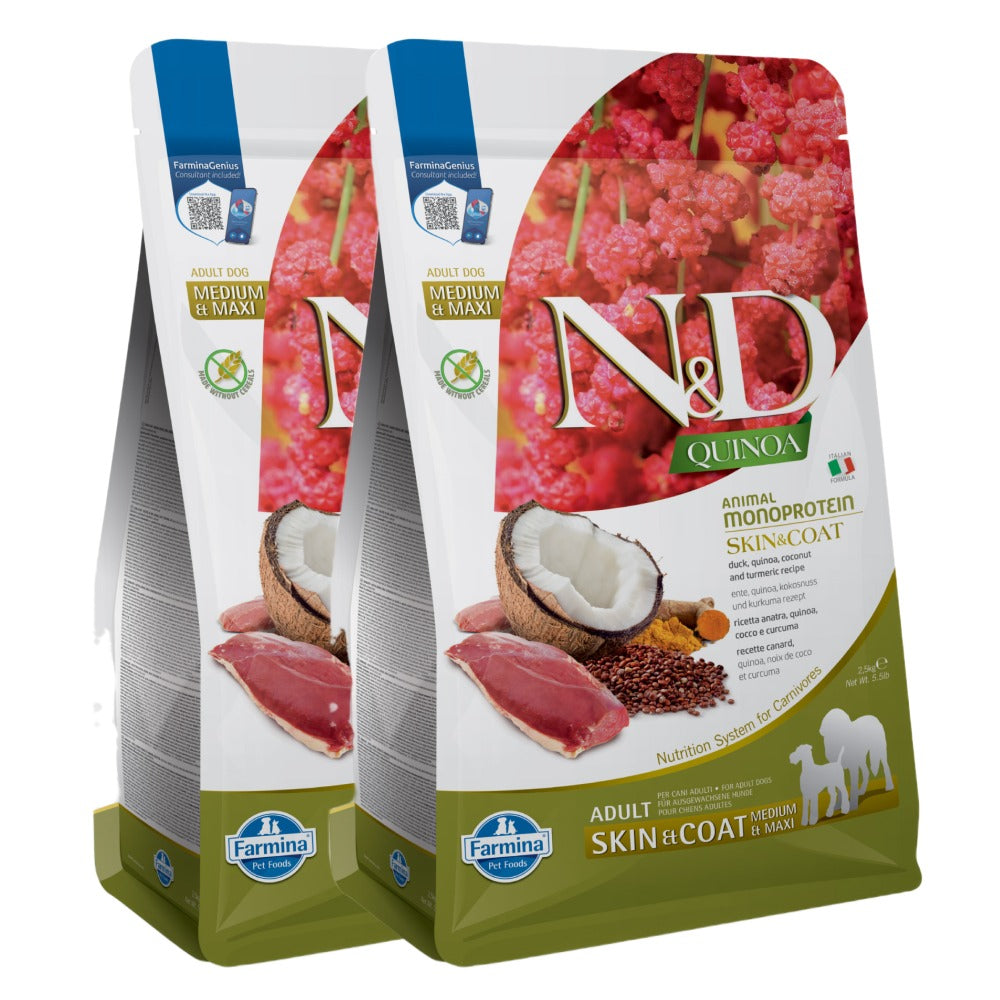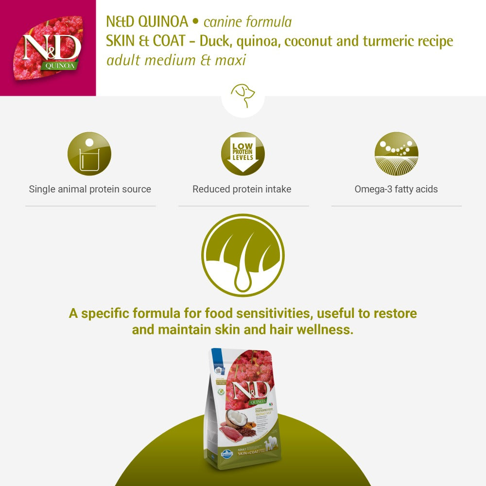 Farmina N&D Grain Free Quinoa Skin and Coat Duck Adult Dry Dog Food is is a complete dietetic food, suggested for the reduction of ingredient and nutrient intolerance. It is perfect for all adult dogs of any breed size, above the age of 18 months. Duck, quinoa, coconut and turmeric recipe. A specific formula for food sensitivities, useful to restore and maintain skin and hair wellness.