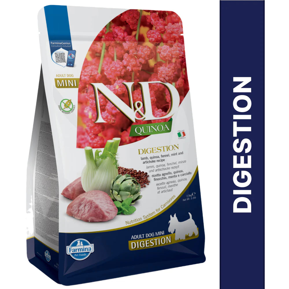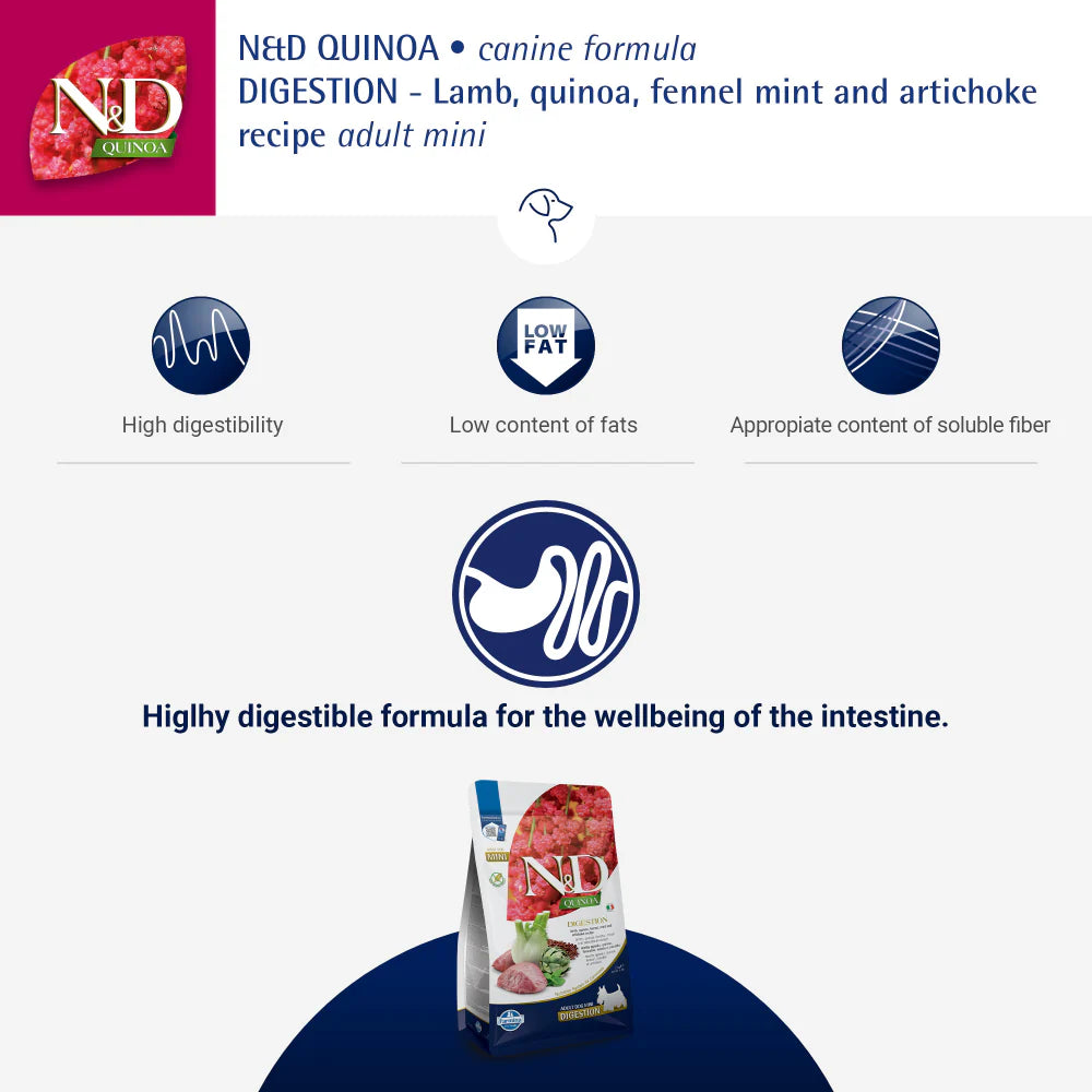 Farmina N&D Grain Free Quinoa Lamb Digestion Adult Dry Dog Food is perfect for all adult dogs, above the age of 18 months. Highly digestible formula for the wellbeing of the intestine. N&D Quinoa Digestion is a complete dietetic food for dogs, suggested for the compensation for maldigestion and exocrine pancreatic insufficiency.