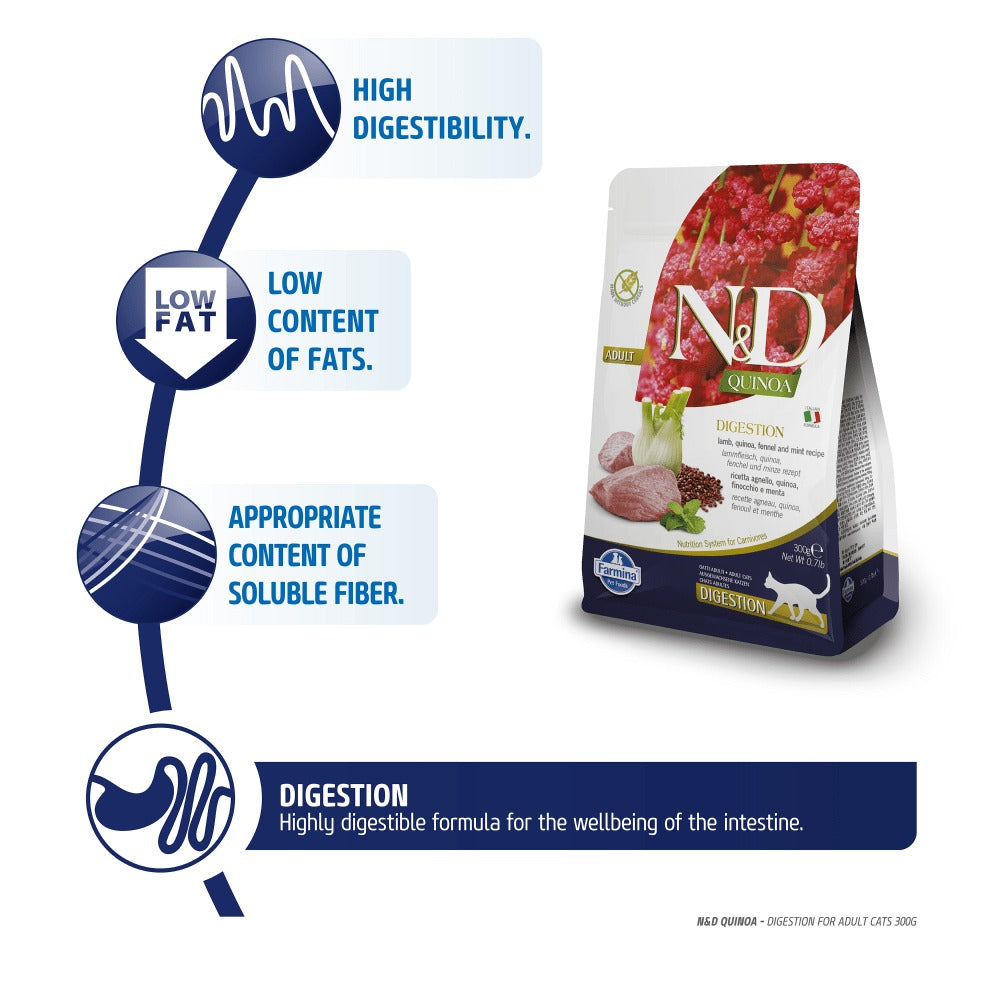 N&D Digestion Dry Cat food in Quinoa is the new Grain Free Line developed in Italy with first class regional ingredient and is a functional food for cats and dogs with specific nutritional needs. Quinoa is a superfood that fits perfectly into the Farmina Nutrition System for Carnivores Philosophy as it contains about 15% high biological value proteins, rich in well-balanced essential amino acids, a very rare type of vegetable. feature. This product helps the product to increase the protein content of the product with 92% protein which in total comes from animal origin. N&D Quinoa uses real ingredients to provide your pet with a balanced and complete diet without any grains, GMOs, or artificial preservatives. This range includes quinoa from organic farming in Italy. N& D Quinoa Dry Cat Food is available in all breeds - in kibble sizes tailored to your cat's specific nutritional needs.