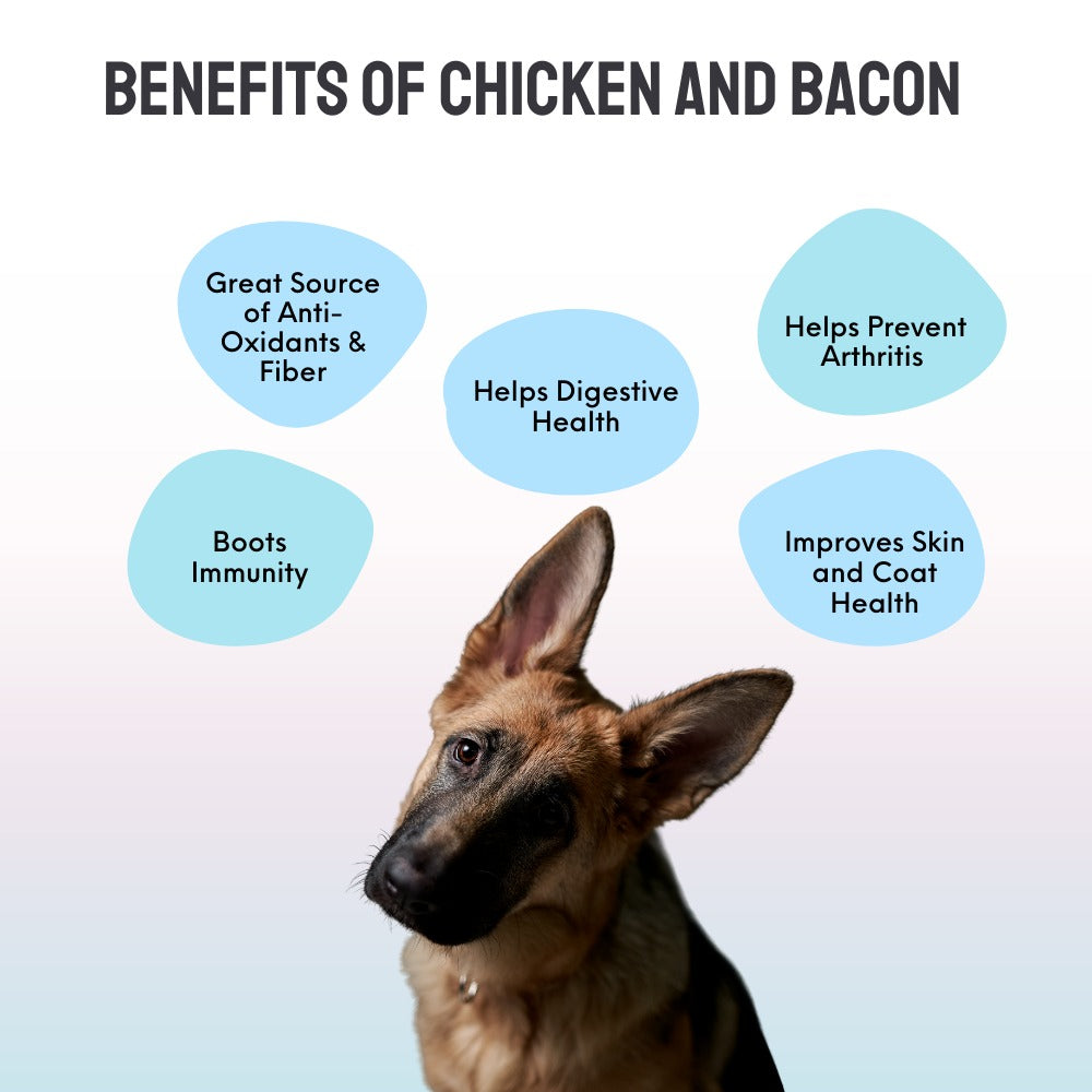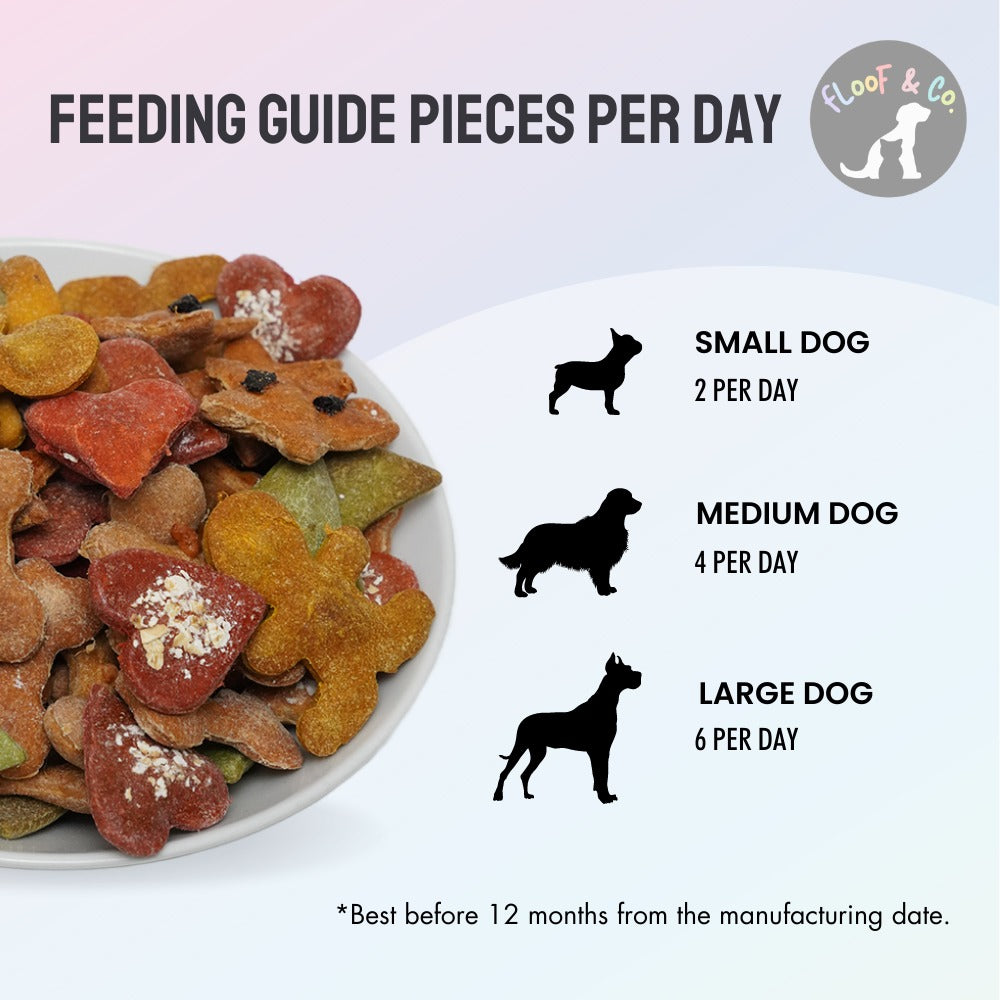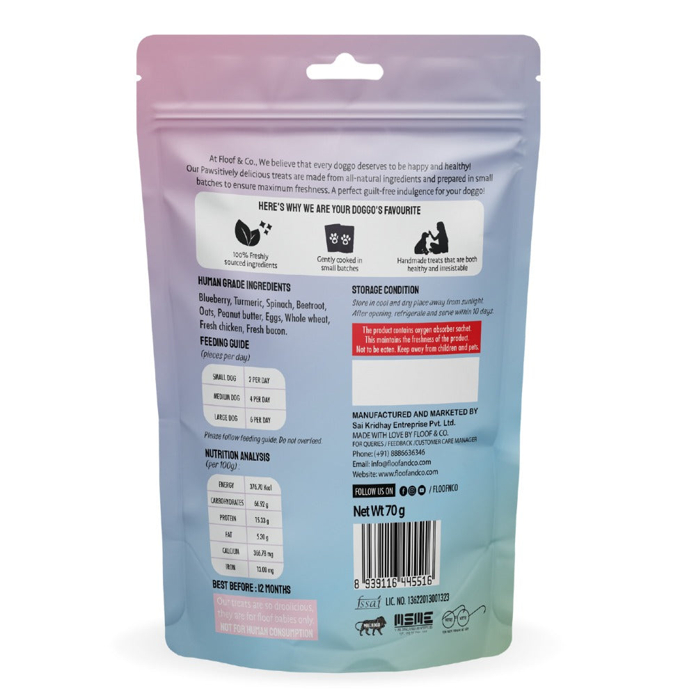 Floof & Co's premium dog treats—a tantalizing blend that ignites tail-wagging bliss! Brimming with nourishment, these treats feature an array of wholesome ingredients, including blueberry, turmeric, spinach, beetroot, oats, peanut butter, eggs, whole wheat, fresh chicken, and fresh bacon. Indulge your furry friend with a nutritious medley that will bring them unbridled joy. Our Treats are an ideal choice, whether for training or rewarding your four-legged companion. Its convenient bite size pieces facilitate training sessions, while offering a delectable and nutritious snack that your pet will adore. Our Treats boasts a tantalizing texture and mouthwatering meaty taste that pets simply can't resist. Our product is meticulously crafted to suit dogs of all breeds, ensuring a perfect fit for every furry companion. Our Treats are abundant in muscle-fueling protein and low in fat, making it the ultimate energy-boosting snack for active dogs. With lean chicken as the premium protein source, it promotes optimal muscle growth and repair.