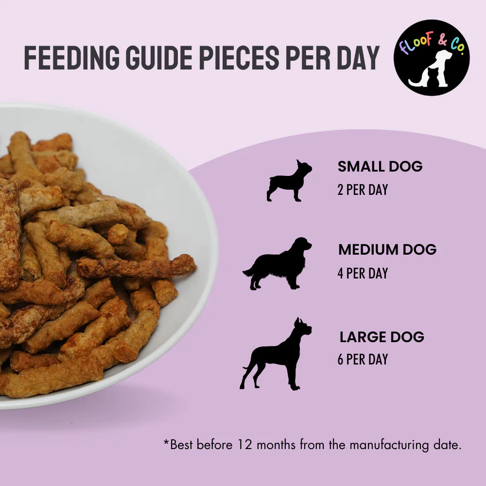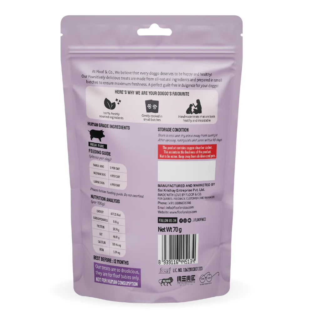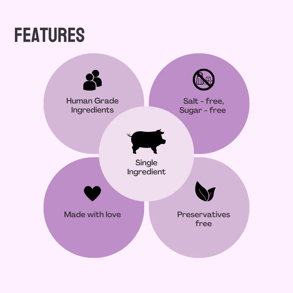 Our crispy jerky is exclusively crafted from top-quality, human-grade pork, ensuring a safe and delightful treat for your beloved pet. We never compromise, strictly avoiding any animal by-products, binding agents, or sweeteners. Your pet deserves nothing less than the finest. Our jerky is an ideal choice, whether for training or rewarding your four-legged companion. It conveniently breaks into smaller pieces, facilitating training sessions, while offering a delectable and nutritious snack that your pet will adore. Our chewy jerky boasts a tantalizing texture and mouthwatering meaty taste that pets simply can't resist. Our product is meticulously crafted to suit dogs of all breeds, ensuring a perfect fit for every furry companion. Our jerky is abundant in protein, low in fat, and perfect for energizing active dogs. Crafted with premium pork, it offers a high-quality protein source, essential for muscle growth and repair.