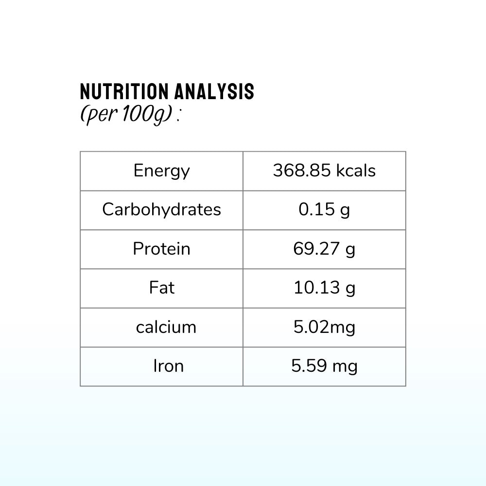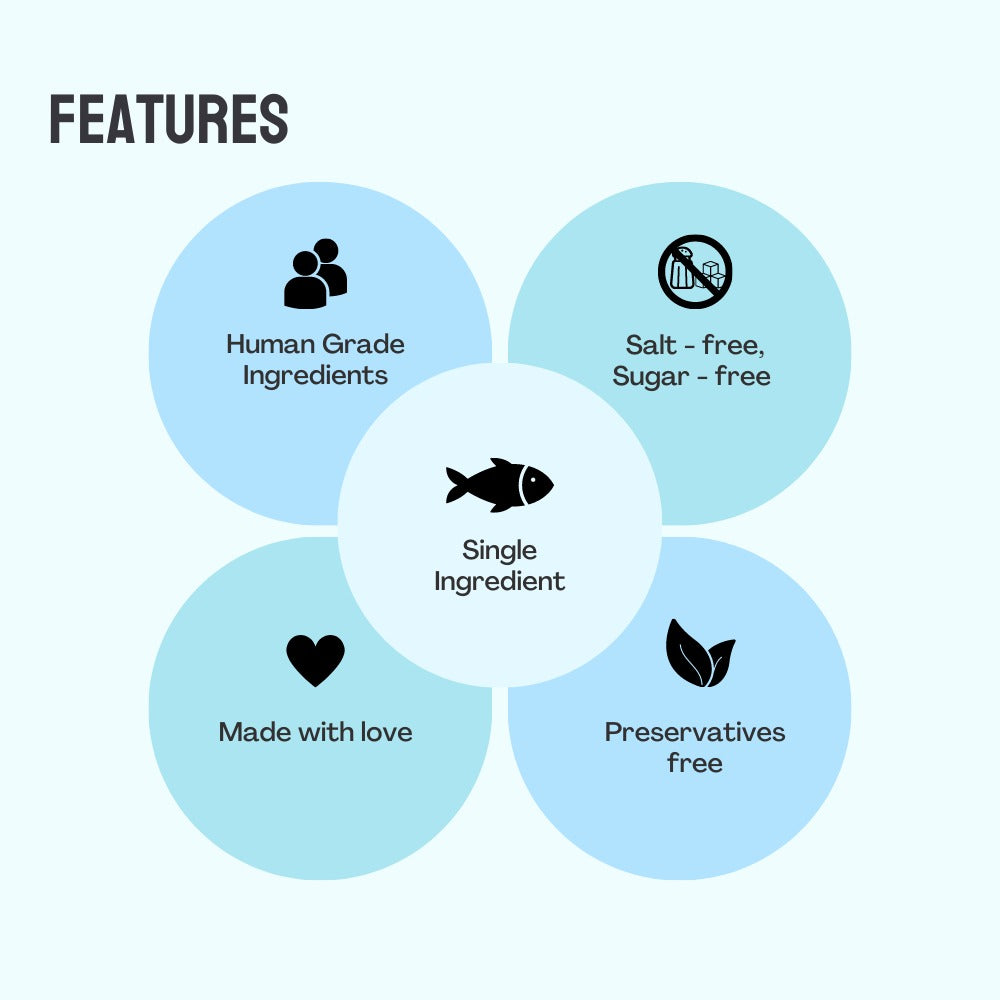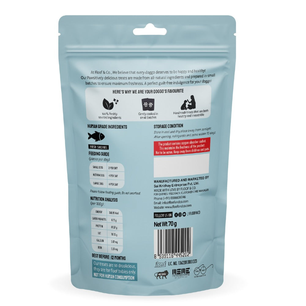 Our crunchy jerky is meticulously crafted from premium, human-grade sardines, providing a safe and delectable treat for your beloved pet. With an unwavering commitment, we abstain from using any animal by-products, binding agents, or sweeteners. Rest assured, your pet receives nothing but the epitome of quality. Our jerky is an ideal choice, whether for training or rewarding your four-legged companion. It conveniently breaks into smaller pieces, facilitating training sessions, while offering a delectable and nutritious snack that your pet will adore. Our chewy jerky boasts a tantalizing texture and mouthwatering meaty taste that pets simply can't resist. Universally Tailored: Our product is meticulously crafted to suit dogs of all breeds, ensuring a perfect fit for every furry companion. Our jerky brims with protein and low-fat goodness, serving as the perfect snack for energizing active dogs. Crafted with premium sardines, it offers a top-notch protein source that fuels muscle growth and repair.