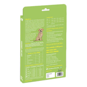 It has large amounts of VITAMIN A, Bs, C & K and minerals in goodquantity namely, IRON, ZINC, POTASSIUM, MAGNESIUM, MANGANESE, CALCIUM & SELENIUM. These vitamins and minerals are good for your dog’s VISION, SKIN, DIGESTION, IMMUNE SYSTEM, NERVES and HEART. The leafy vegetables arerich in ANTIOXIDANTS, BETA- CAROTENE which stimulates DIGESTION. The other ingredients have ANTI- INFLAMMATORY &ANTI- ALLERGEN properties which help boosts IMMUNITY, REDUCE ALLERGIES, INFECTIONS, SHINE & STRENGTH to hair, LOWER CHOLESTEROL.
