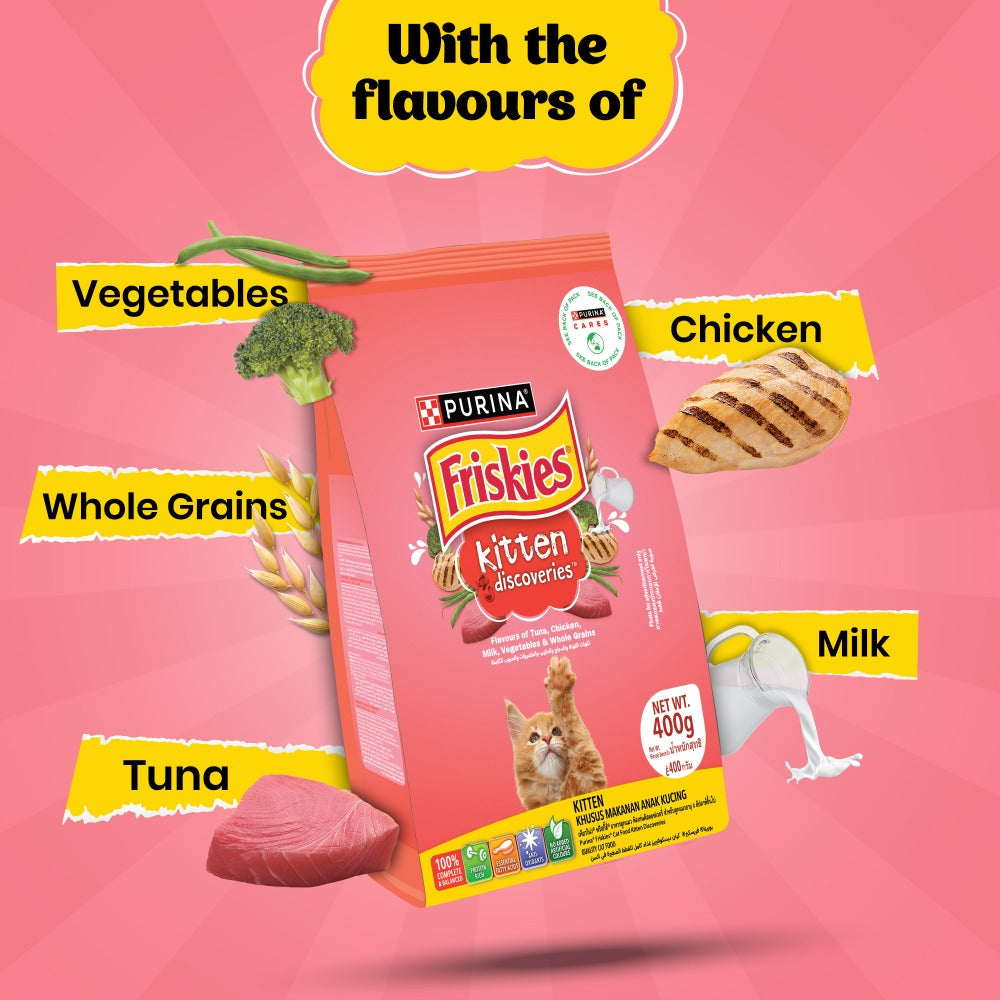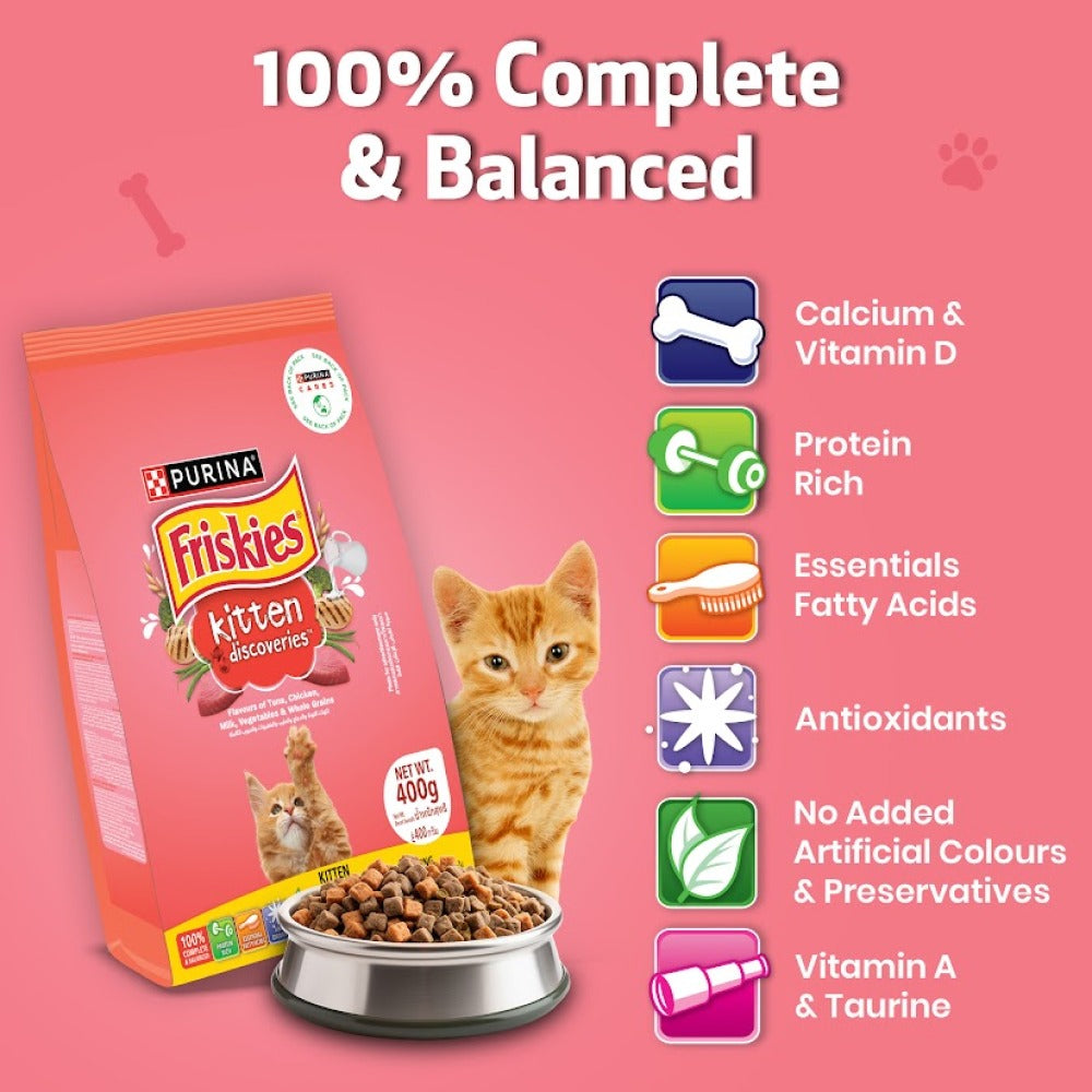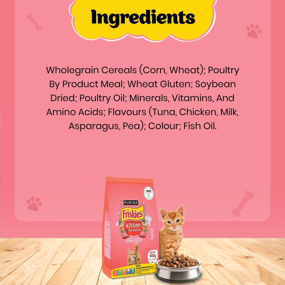 Bursting with the irresistible flavour blend of Tuna, Chicken, Milk, Vegetables, & Whole Grains, Friskies Kitten Discoveries (For kittens up to the age of 12 months) delights your pet with every crunchy bite. This nutritious blend is packed with protein to promote lean muscle development and antioxidants to support a healthy immune system. Essential vitamins and minerals ensure overall well-being, while fatty acids support healthy skin and a shiny coat. Additionally, Vitamin A, Taurine, Calcium, & Vitamin D are included to maintain healthy vision and heart function and aid in developing strong bones and teeth, making every meal a balanced feast for your feline friend. Safety Information: To ensure lasting freshness, transfer the pack's contents into an airtight container. Storage: Please Store This Pack In A Cool, Dry Place, Away from direct sunlight.
