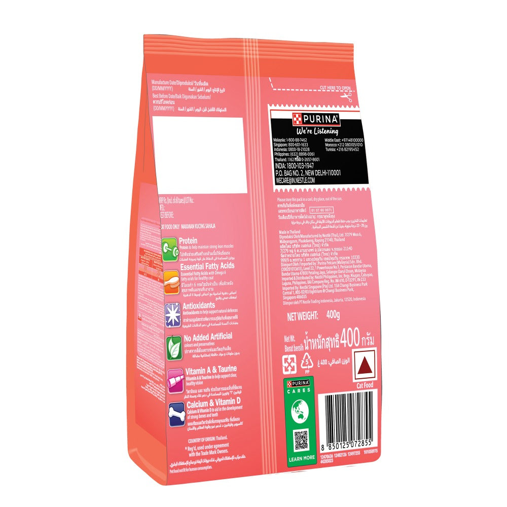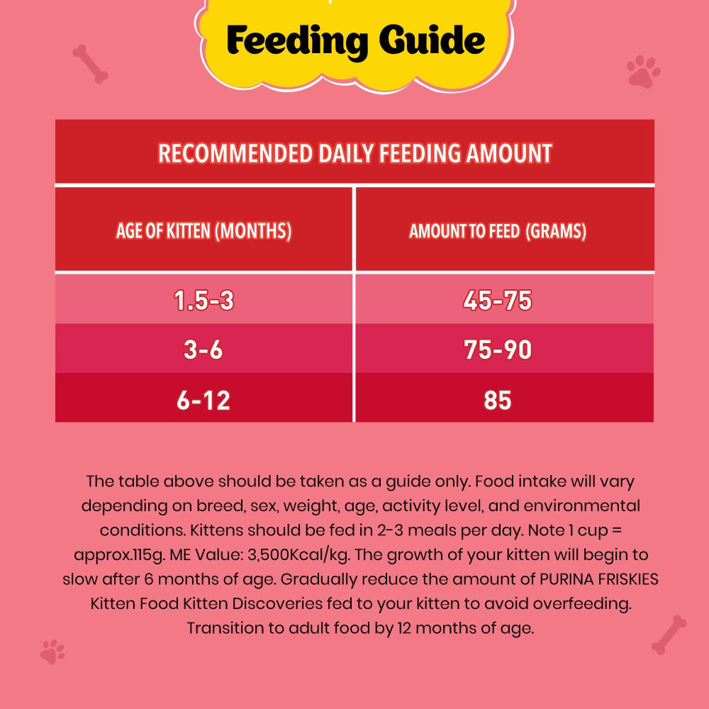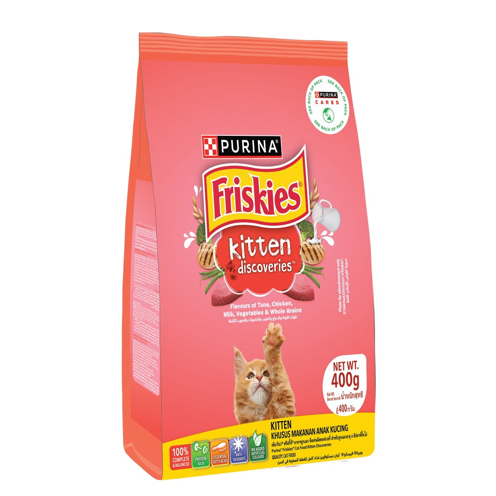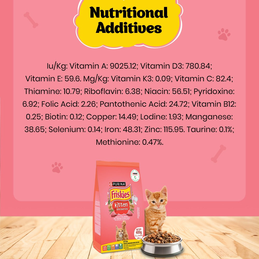Bursting with the irresistible flavour blend of Tuna, Chicken, Milk, Vegetables, & Whole Grains, Friskies Kitten Discoveries (For kittens up to the age of 12 months) delights your pet with every crunchy bite. This nutritious blend is packed with protein to promote lean muscle development and antioxidants to support a healthy immune system. Essential vitamins and minerals ensure overall well-being, while fatty acids support healthy skin and a shiny coat. Additionally, Vitamin A, Taurine, Calcium, & Vitamin D are included to maintain healthy vision and heart function and aid in developing strong bones and teeth, making every meal a balanced feast for your feline friend. Safety Information: To ensure lasting freshness, transfer the pack's contents into an airtight container. Storage: Please Store This Pack In A Cool, Dry Place, Away from direct sunlight.