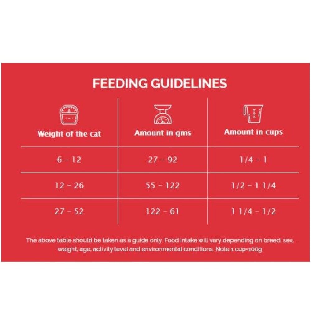 Crude Protein (Min) 32.0%, Crude Fat (Min) 11.0%, Crude Fibre (Max) 3.5%, Moisture (Max) 12.0%, Crude Ash (Max) 9.5%, Calcium (Min) 1.0%, Taurine (Min) 0.1%, Omega 3 Fatty Acids (Min) 0.05%, Omega 6 Fatty Acid (Min) 1.0%, Vitamin A (Min) 8385 lu/Kg, Vitamin D (Min) 780 lu/kg, Metabolizable Energy (Me) 3.50 Kcal/G