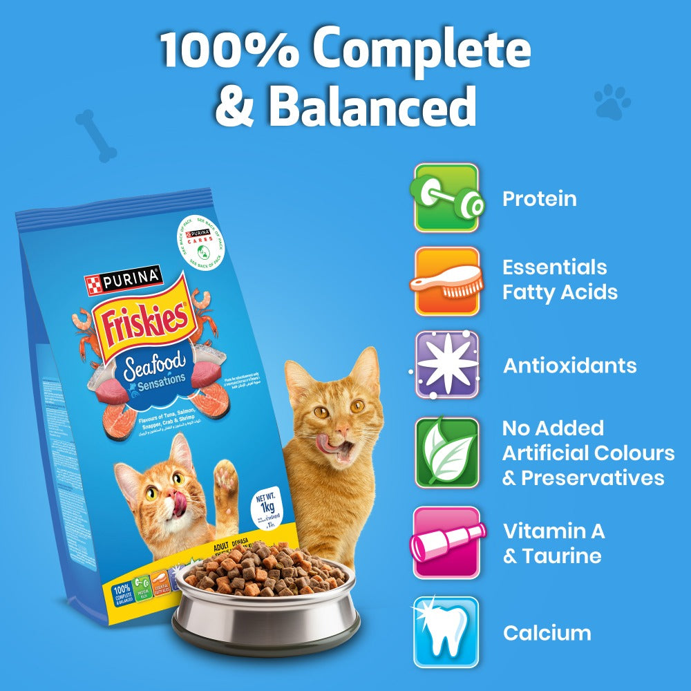 Bursting with the irresistible Mackerel, Tuna, Salmon, and Sardine flavour blend, FRISKIES Surfin' Favourites delights your cat with every crunchy bite. This nutritious blend is packed with protein to promote lean muscle development and antioxidants to support a healthy immune system. Essential vitamins and minerals ensure overall well-being, while fatty acids support healthy skin and a shiny coat. Vitamin A and taurine are also included to maintain healthy vision and heart function, making every meal a balanced feast for your feline friend. Safety Information: To ensure lasting freshness, transfer the pack's contents into an airtight container. Storage: Please Store This Pack In A Cool, Dry Place, Away from direct sunlight.