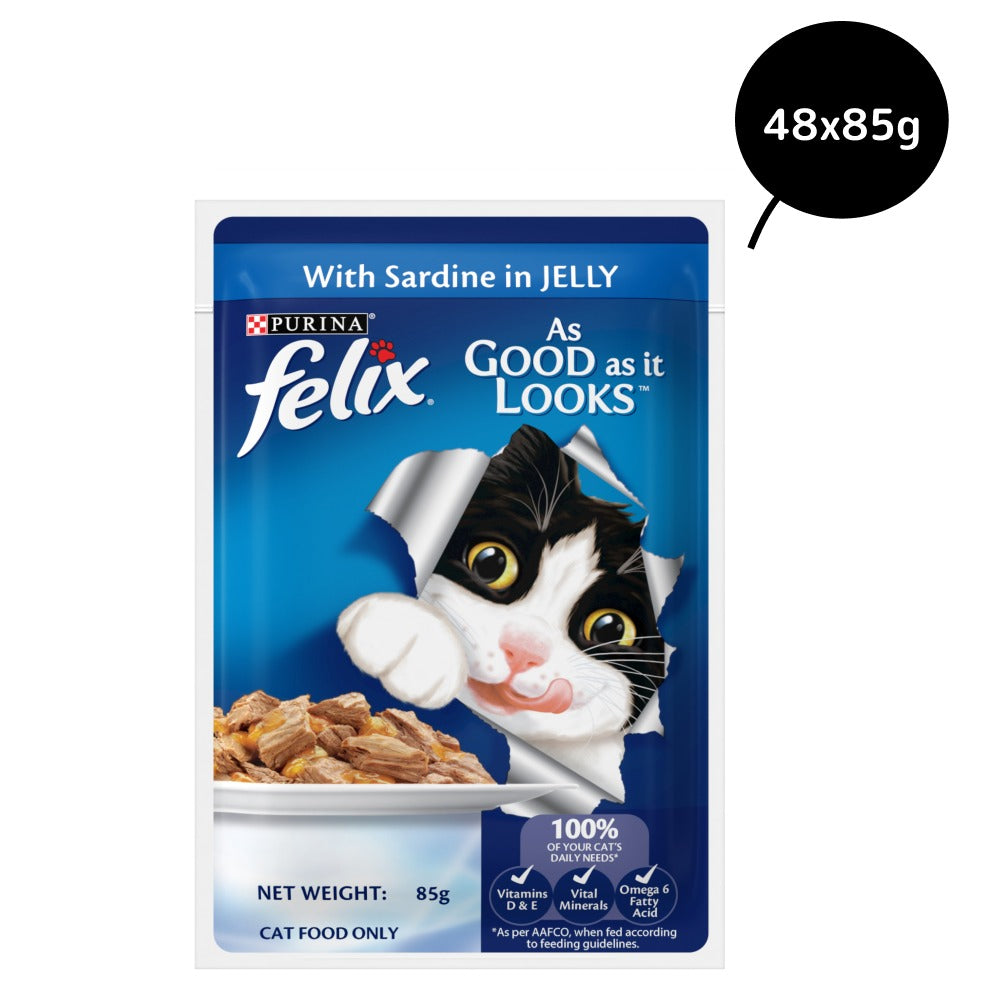 Felix As Good as it Looks™ is a range of delicious meals specially prepared with tender meaty pieces in a succulent jelly which look and smell so meaty, it looks like food you have cooked yourself. They are full of healthy goodness to satisfy 100% of your cat's daily needs when fed according to the feeding guidelines on the pack.