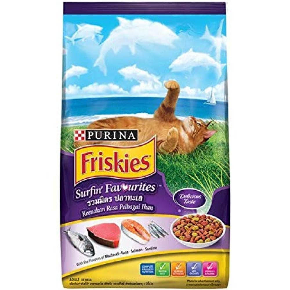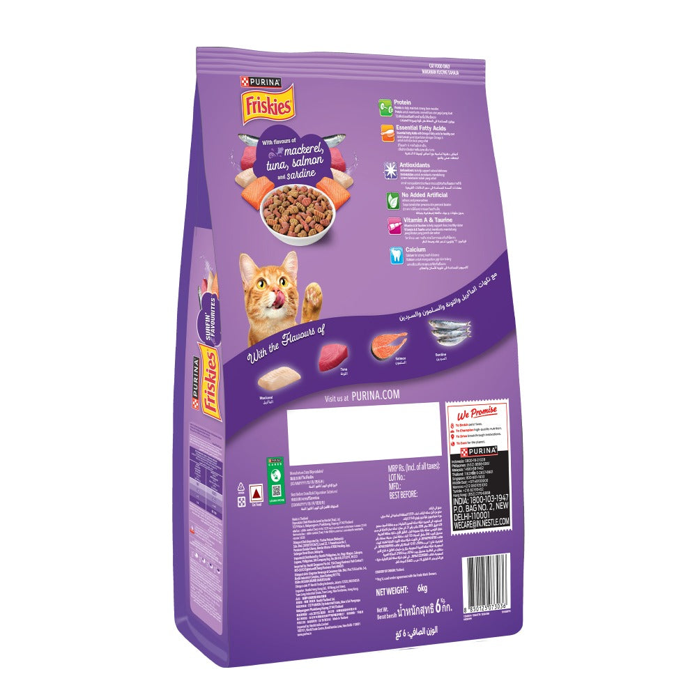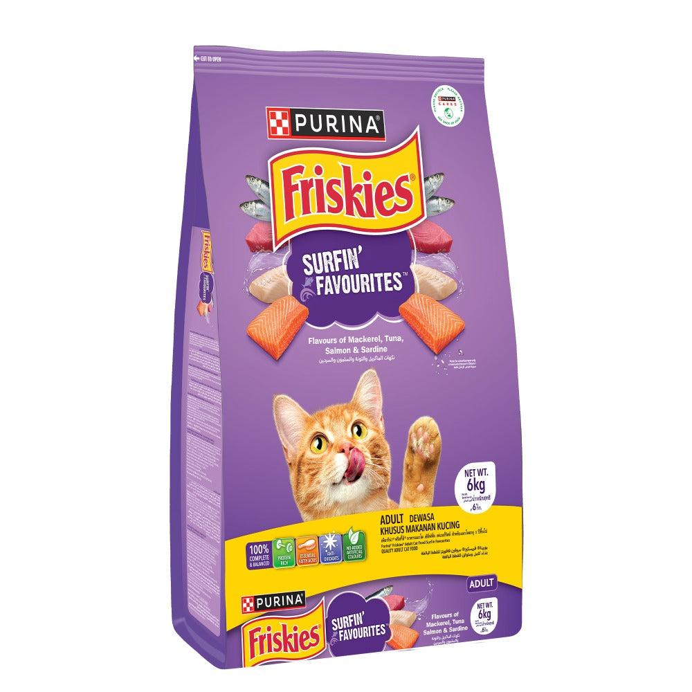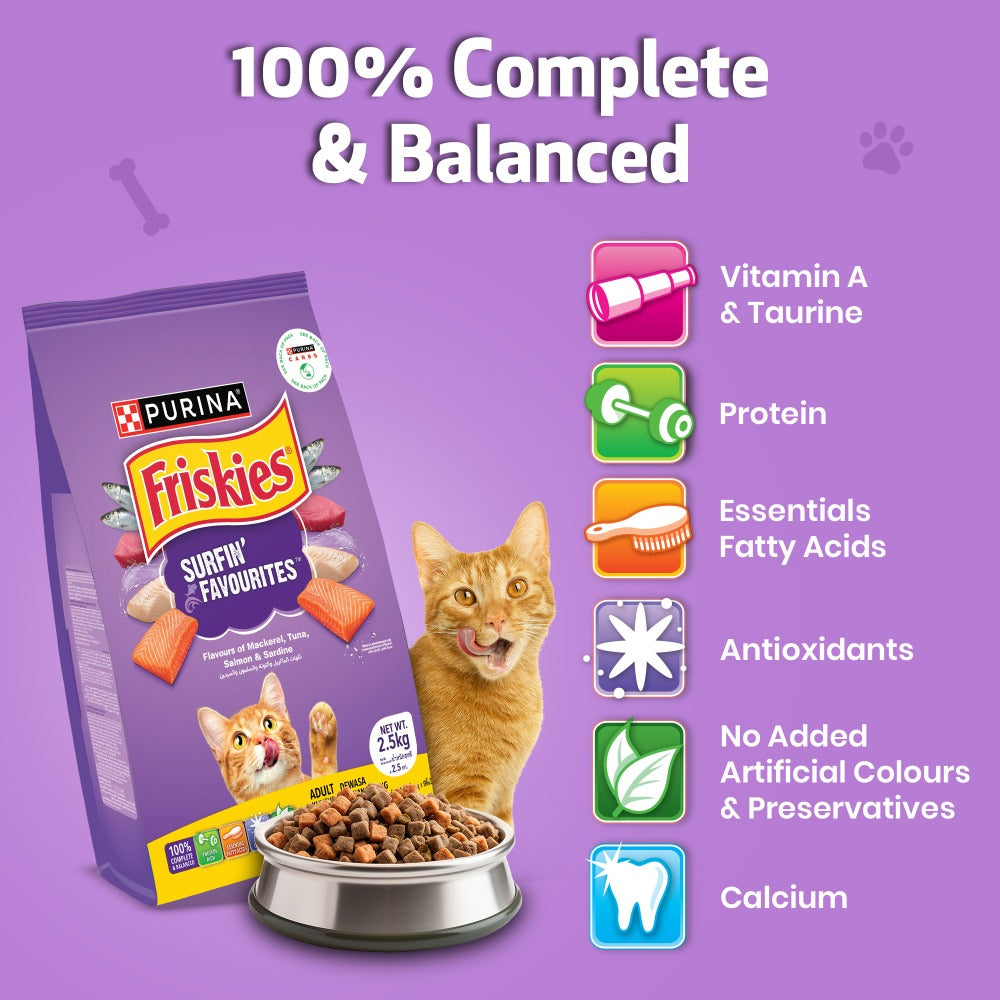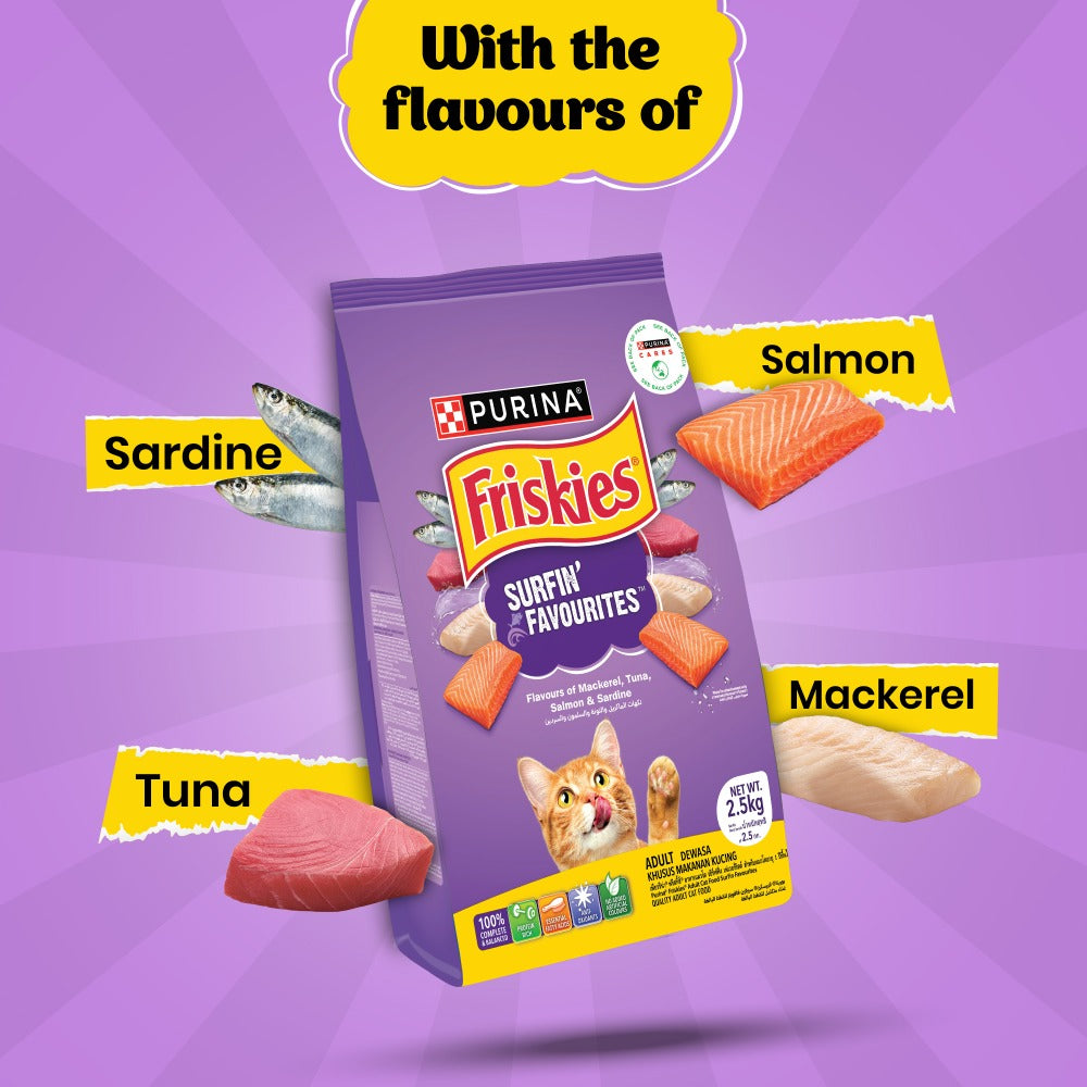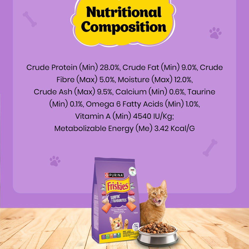 Bursting with the irresistible Mackerel, Tuna, Salmon, and Sardine flavour blend, FRISKIES Surfin' Favourites delights your cat with every crunchy bite. This nutritious blend is packed with protein to promote lean muscle development and antioxidants to support a healthy immune system. Essential vitamins and minerals ensure overall well-being, while fatty acids support healthy skin and a shiny coat. Vitamin A and taurine are also included to maintain healthy vision and heart function, making every meal a balanced feast for your feline friend. Safety Information: To ensure lasting freshness, transfer the pack's contents into an airtight container. Storage: Please Store This Pack In A Cool, Dry Place, Away from direct sunlight.