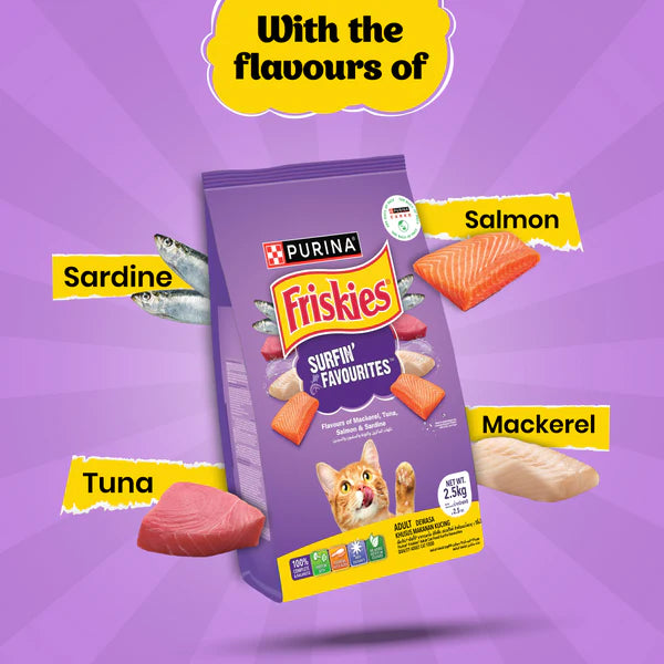 Bursting with the irresistible Mackerel, Tuna, Salmon, and Sardine flavour blend, FRISKIES Surfin' Favourites delights your cat with every crunchy bite. This nutritious blend is packed with protein to promote lean muscle development and antioxidants to support a healthy immune system. Essential vitamins and minerals ensure overall well-being, while fatty acids support healthy skin and a shiny coat. Vitamin A and taurine are also included to maintain healthy vision and heart function, making every meal a balanced feast for your feline friend. Safety Information: To ensure lasting freshness, transfer the pack's contents into an airtight container. Storage: Please Store This Pack In A Cool, Dry Place, Away from direct sunlight.