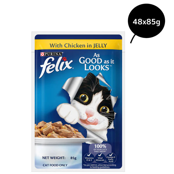 Clever Cats get FELIX! FELIX Adult with Chicken in Jelly is the irresistibly tasty cat wet food for loveable, mischievous little rascals. FELIX As Good as it Looks is full of tender meaty pieces in a succulent jelly.