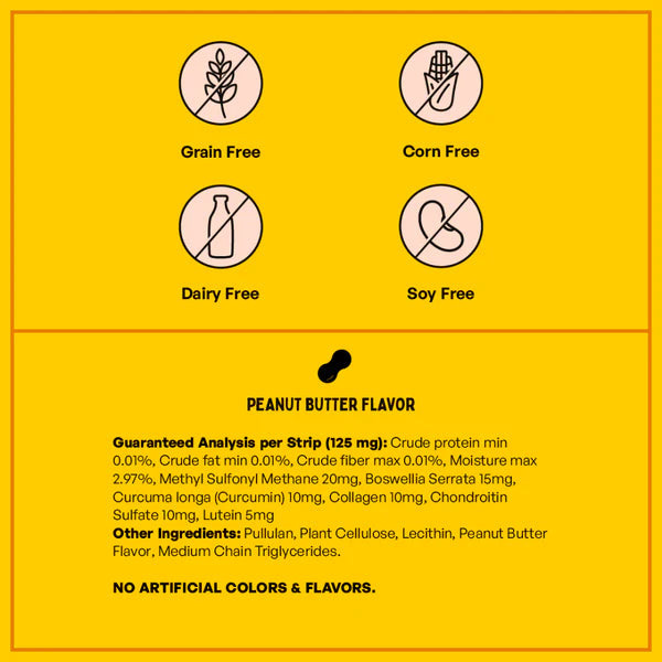 Guaranteed Analysis per Strip (125 mg): Crude protein min 0.01 %, Crude fat min 0.01 %, Crude fiber max 0.01 %, Moisture max 2.97%, Calcium (As Di Calcium Phosphate) 8mg max 6.407 %, Phosphorus (As Di Calcium Phosphate) 6mg min 4.80%, Serratiopeptidase min 8000 IU, Methyl Sulfonyl Methane (MSM) 30mg, Chondroitin Sulfate 25mg, Glucosamine 20mg, Boswellia Serrata Extract 15mg, Curcuma Langa (Curcumin)10mg. Other Ingredients: Medium Chain Triglycerides, Pullulan, Plant Cellulose, Lecithin, Peanut Butter Flavor.