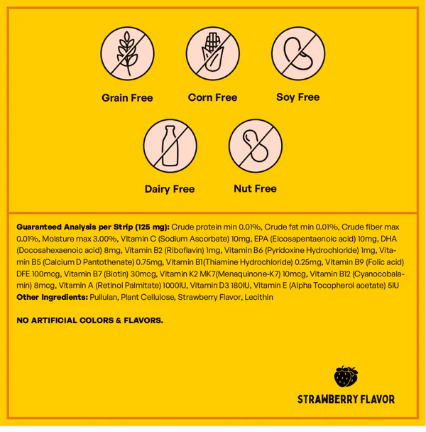 Guaranteed Analysis per Strip (125 mg): Crude protein min 0.01%, Crude fat min 0.01%, Crude fiber max 0.01 %, Moisture max 3.00%, Calcium (Di Calcium Phosphate) 8mg min &; max 7.528 %, Phosphorus (As Di Calcium Phosphate) 6mg min 5.646 %, Iron (as Ferric saccharate) 4mg min 5.263 %, Chloride (as Potassium chloride) 3mg min 2.860%, Magnesium (as Magnesium Oxide) 5mg min 2.660 %, Zinc (as Zinc Sulphate) 2mg min 2.469 %, Manganese (as Manganese sulphate Monohydrate) 1mg min 1.145 %, Copper (as Copper Sul- phate) 0.3mg min 0.377 %, lodine (as Potassium Iodide) 50mcg min 0.033 %, Selenium (as L Selenomethi- onine) 10mcg min 0.005 %, Vitamin A (Retinol Palmitate) min 1000 IU, Vitamin D3 (850IU/mg) min 180 IU, Vita- min E (Alpha Tocopherol) min 20 IU, Vitamin C (Sodium Ascorbate) min 10 mg, Vitamin B6 (Pyridoxine Hydro- chloride) min 1 mg, Vitamin B2 (Riboflavin) min 1 mg, Vitamin K2 MK7 (Menaquinone-K7) min 10 mcg, Vitamin B5 (Calcium D Pantothenate) min 0.75 mg, Vitamin B1 (Thiamine Hydrochloride) min 0.25 mg, Vitamin B9 (Folic acid) DFE min 100 mcg, Vitamin B7 (Biotin) min 30 mcg, Vitamin B12 (Cyanocobalamin) min 8 mcg, Eicosapen- taenoic acid (EPA) 10mg, Docosahexaenoic acid (DHA) 8mg. Other Ingredients: Pullulan, Plant Cellulose, Lecithin, Salmon Flavor. *Probiotics: Lactobacillus acidophilus used is 200 BCFU/g